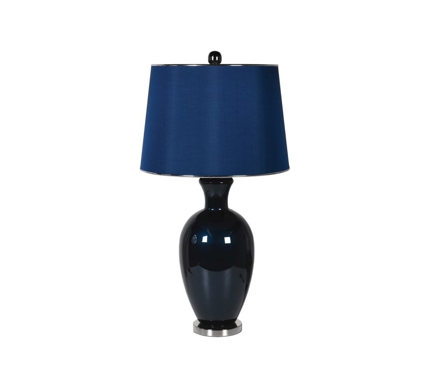 Stolová lampa má klasický tvar s oblou keramickou podstavou, ktorá pripomína vázu. Povrch podstavy je lesklý, v tmavomodrom odtieni, ktorý dodáva lampe elegantný a nadčasový vzhľad. Textilné tienidlo má tradičný kónický tvar a sýtu modrú farbu, ktorá ladí s podstavou a vytvára harmonickú farebnú kombináciu. Na spodnej časti podstavca sa nachádza kovový prvok s hladkým, strieborným povrchom, ktorý pridáva moderný akcent. Štýlovo zapadá do klasického, glamour alebo art deco interiéru, kde jej farebné a materiálové prevedenie zvýrazní luxusný charakter priestoru.