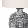 Dizajnová stolná lampa má jemne zaoblený tvar základne pripomínajúci vázu. Povrch lampy je glazúrovaný, čo jej dodáva lesklý a elegantný vzhľad, a je zdobený geometrickým vzorom pripomínajúcim textúru mozaiky alebo šachovnice. Farba základne je kombináciou sivej a čiernej s patinovaným efektom, ktorý pôsobí luxusne a zároveň dodáva lampe vintage charakter.