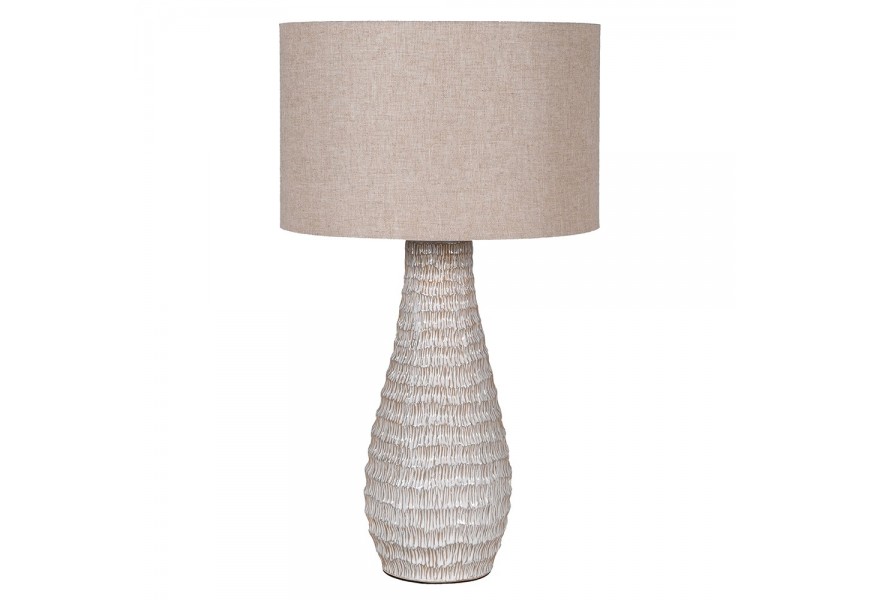 Stolná lampa má štíhlu, mierne rozšírenú základňu so zaujímavou plastickou textúrou, ktorá pripomína vrstvený alebo skladaný povrch. Povrch je glazúrovaný, čo jej dodáva elegantný a lesklý vzhľad. Farba základne je svetlá, v odtieňoch bielej a jemnej béžovej, s detailmi zvýrazňujúcimi štruktúru, čo pôsobí sofistikovane a prírodne.