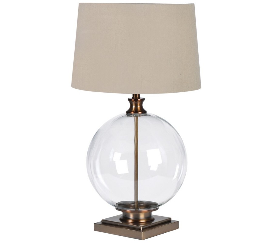Lampa s výraznou guľovou podstavou vyrobenou z číreho skla kombinuje nadčasový dizajn a luxusné materiály. Nohu tvorí sklenená guľa, ktorá pôsobí vzdušne a elegantne, pričom je doplnená kovovou podstavou a centrálnou tyčou v antik bronzovej farbe s jemným leskom. Povrch skla je hladký a priezračný, čo jej dodáva ľahkosť a sofistikovanosť.