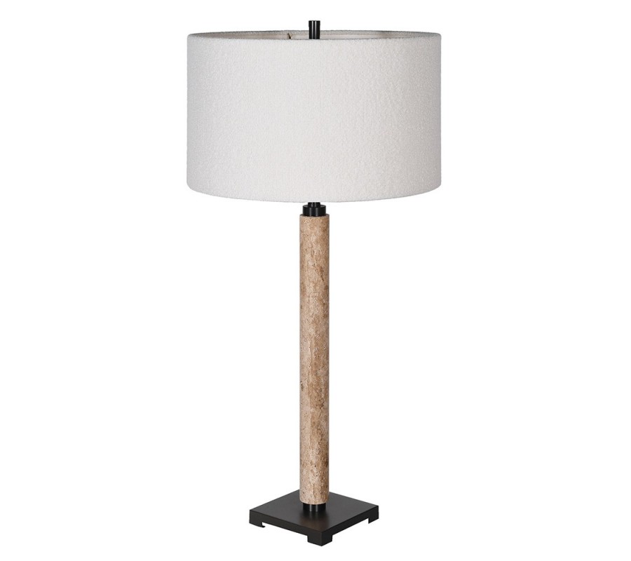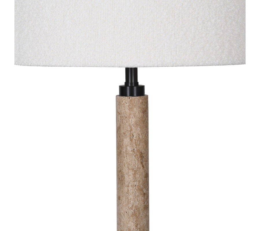 Stolná lampa v modernom dizajne spája elegantné materiály a jednoduché línie. Kovová podstava v čiernej matnej úprave poskytuje stabilitu a harmonicky dopĺňa stredovú časť z mramoru. Mramorový stĺpik je valcového tvaru, v svetlohnedom odtieni s jemnými prírodnými vzormi a hladkým, lešteným povrchom, ktorý zvýrazňuje jeho exkluzivitu.