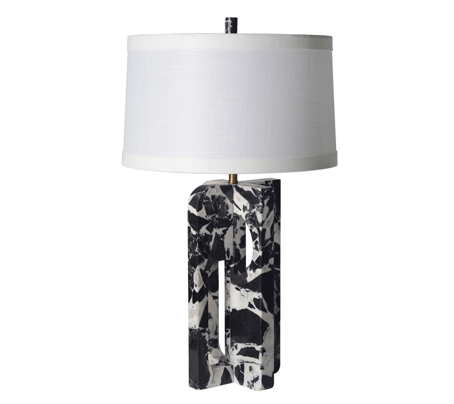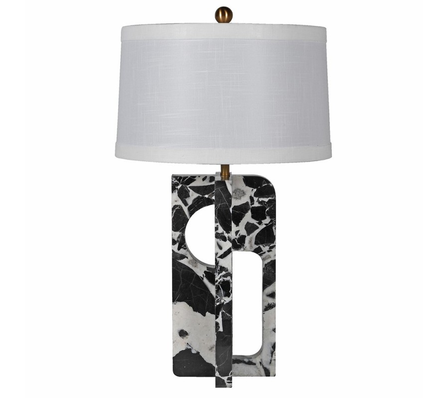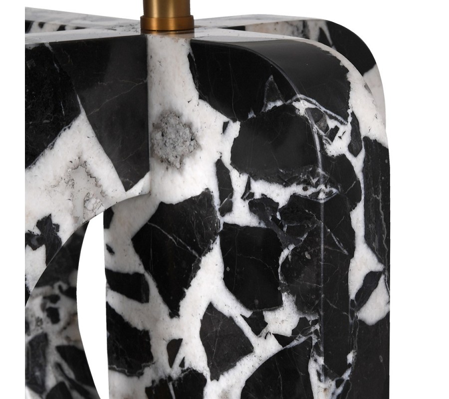 Stolová lampa je elegantným spojením prírodných materiálov a moderného dizajnu. Noha lampy je vyrobená z mramoru v dramatickej čierno-bielej kombinácii, ktorá vyniká svojou textúrou a lesklým povrchom. Má unikátny geometrický tvar s výrezmi a oblúkmi, ktoré vytvárajú dojem umeleckého sochárskeho diela. Povrch mramoru je hladký a lesklý, čím podčiarkuje luxusný charakter lampy.