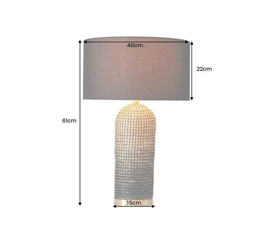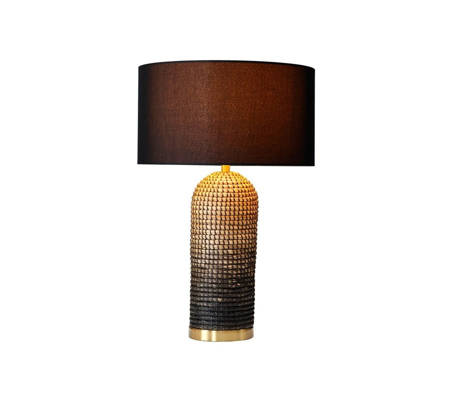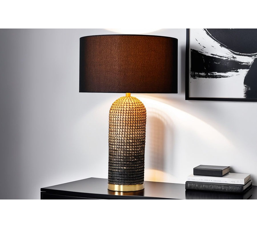 Stolná lampa Draconia je výnimočný dizajnový kúsok v štýle art deco s glamour nádychom, ktorý okamžite upúta svojou štruktúrou, kombináciou materiálov a elegantnými farebnými prechodmi. Valcová noha lampy má kovovú konštrukciu, ktorá je po celej výške pokrytá morskou trávou. Jej povrch zdobí jemný geometrický vzor s nádychom štvorcových segmentov, ktoré sú ručne ukladané a vytvárajú pôsobivý ombré efekt – od svetlohnedej v hornej časti po sýtú čiernu v spodnej.
