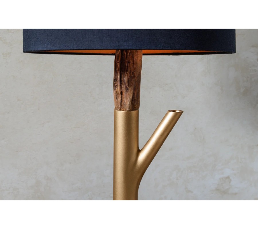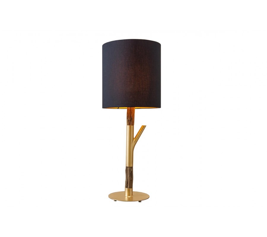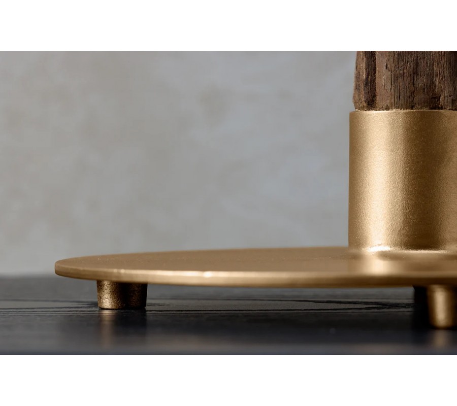 Dizajnu dominuje štíhla noha z dreva v naturálnej tmavšej hnedej farbe. Má výraznú povrchovú štruktúru s vertikálne organizovanou kresbou, ktorá zdôrazňuje jej tvar. V strednej časti nohy nahrádza zlatý kovový valcovitý prvok, z ktorého vychádza menší diagonálny detail, pripomínajúci zrezaný konár. V spodnej časti sa nachádza okrúhla podstava na nízkych nožičkách v rovnakom prevedení, ktorá zaručuje výbornú stabilitu. Povrch kovu je hladký a v spojení s geometrickými líniami vytvára moderný kontrast k drevu.