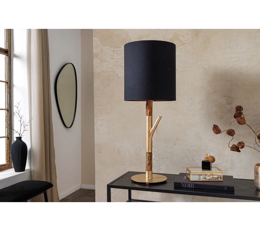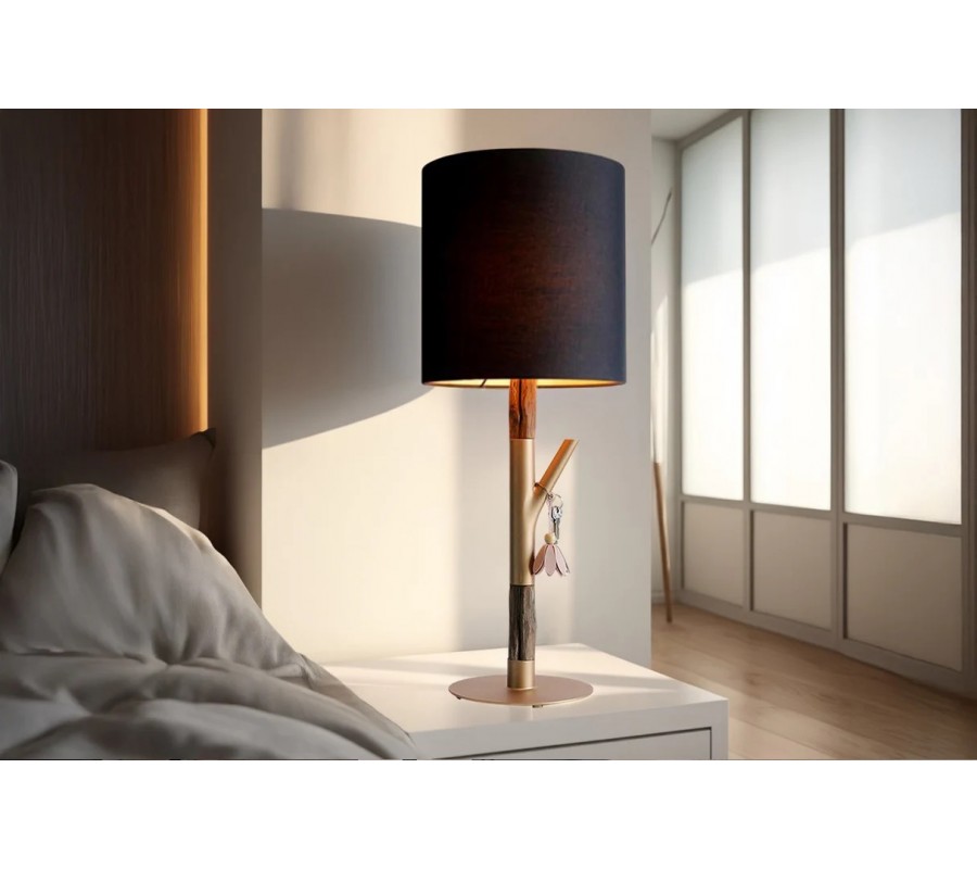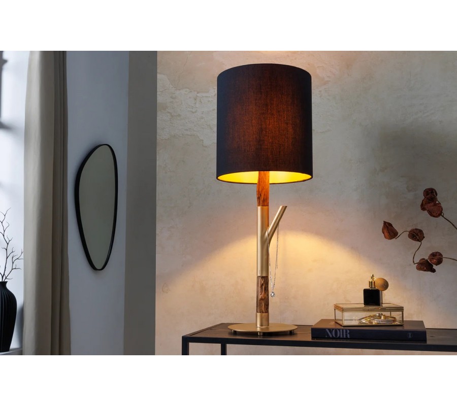 Dizajnová moderná stolná lampa Mervik s čiernym tienidlom a hnedou drevenou nohou so zlatými kovovými detailmi 74 cm