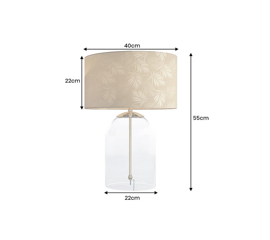 Glamour zlatá stolná lampa Gambier s okrúhlym tienidlom so vzorom palmových listov a priehľadnou sklenenou podstavou 55 cm
