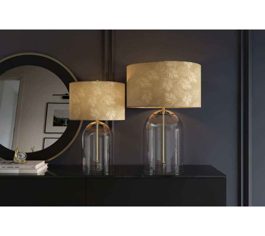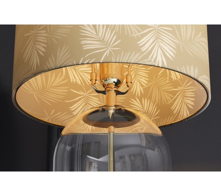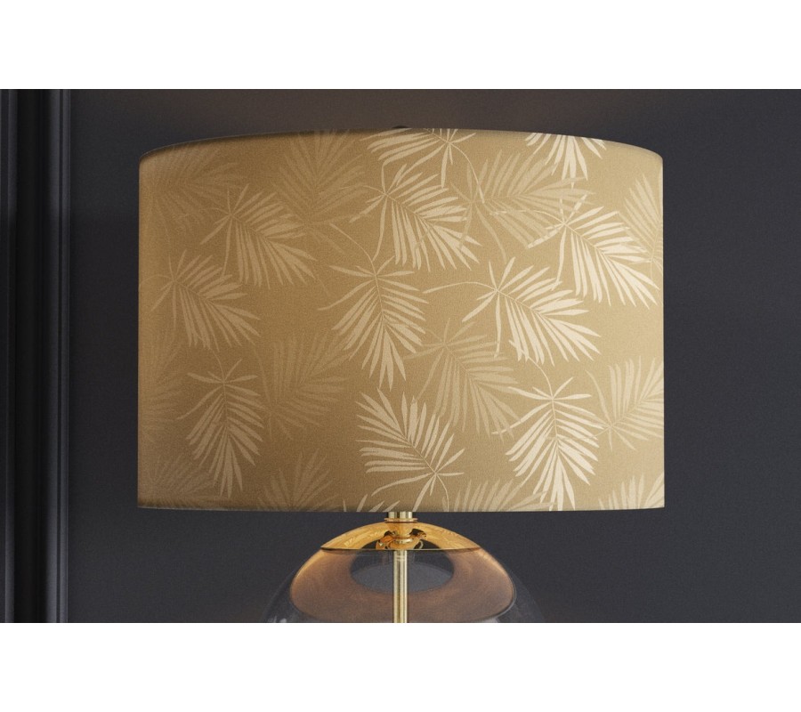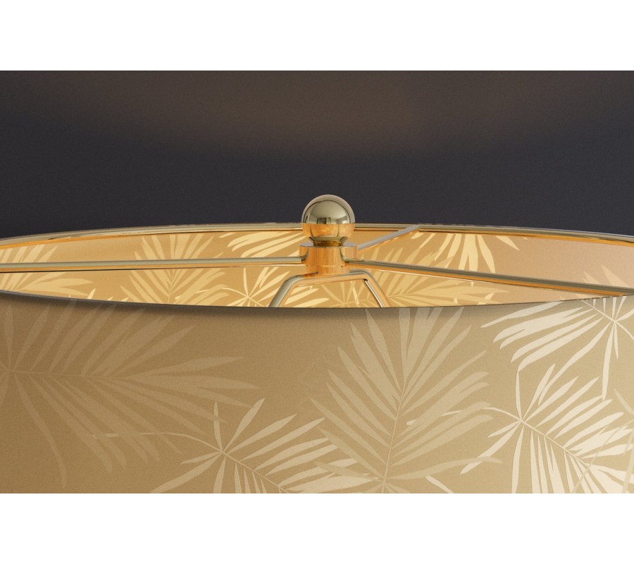 Lampa má valcovité textilné tienidlo. Na hladkom povrchu sa odvíja vzor palmových listov v troch odtieňoch zlatej, vďaka čomu pôsobí dizajn dynamickým dojmom. Na tmavšom pozadí sa mierne prekrývajú asymetricky umiestnené listy v svetlejších odtieňoch, čim vzniká vizuálna hĺbka.