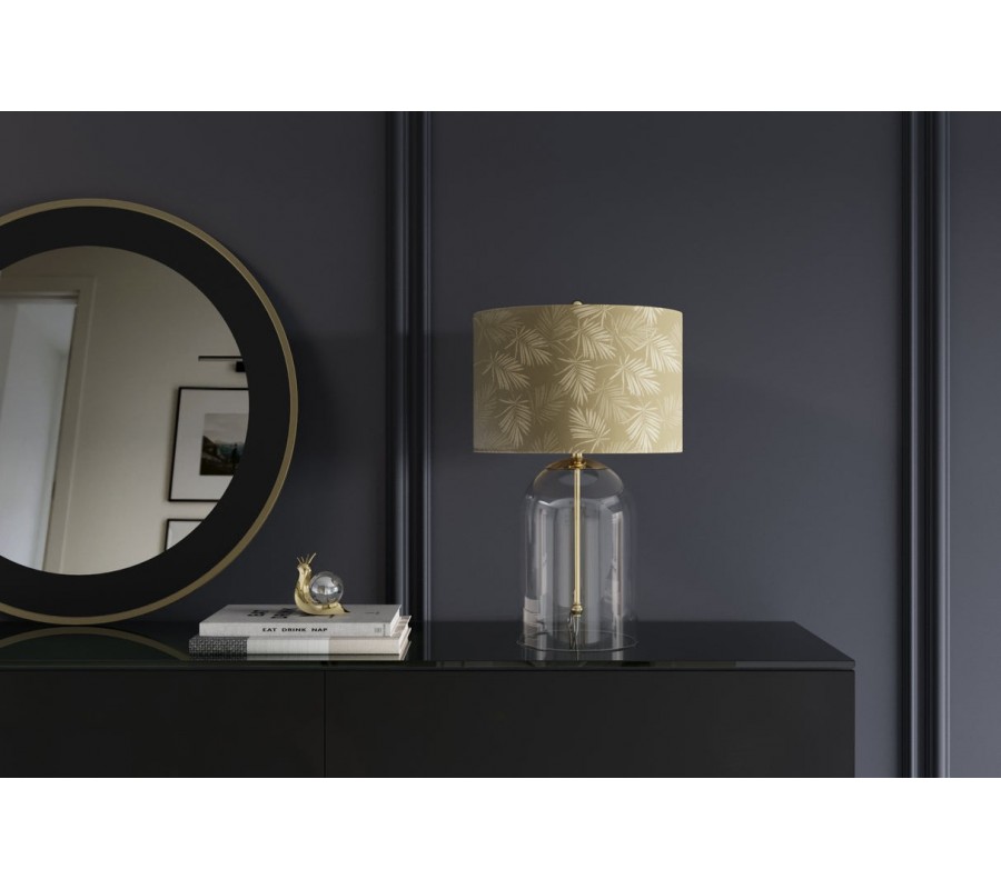 Dizajnová glamour nočná lampa Gambier so zlatým tienidlom so vzorom palmových listov a priehľadnou sklenenou nohou 47 cm