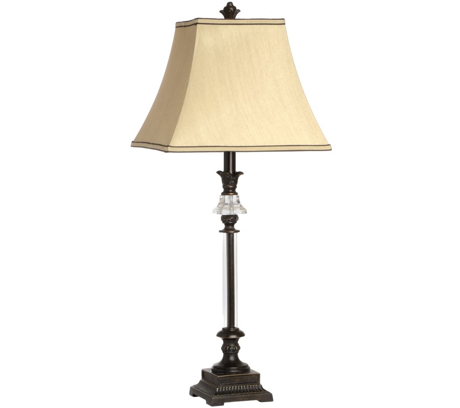 Stolná lampa Richmond v koloniálnom štýle spája klasickú eleganciu s ušľachtilými materiálmi a výraznou vertikálnou kompozíciou. Dominantná noha lampy je vyrezaná zo živice v tmavohnedej farbe a doplnená skleneným valcom okolo stredovej časti, ktorý opticky odľahčuje celkový dizajn. Ďalší dekoratívny sklenený prvok sa nachádza priamo pod tienidlom, čím vytvára harmonické prepojenie medzi konštrukciou a tienidlom.