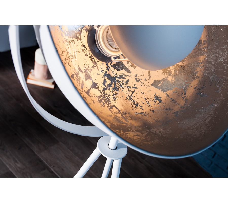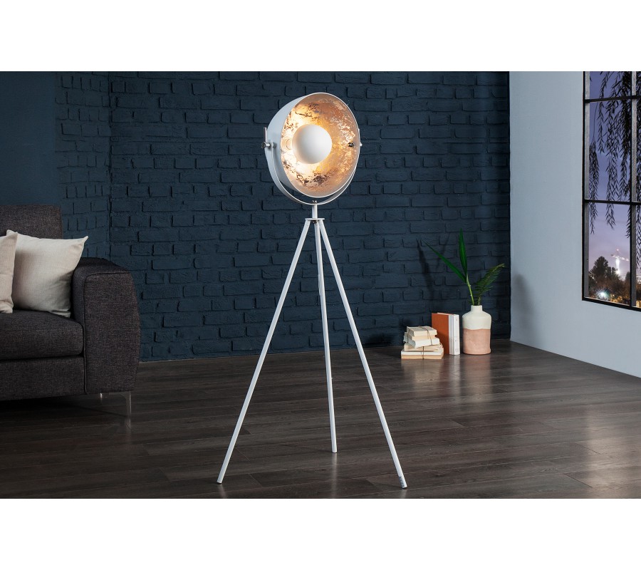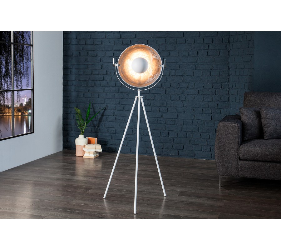 Originálna moderná stojaca lampa Studio na trojnožke predstavuje minimalistický retro štýl. Veľkosť: šírka 65 cm, výška až 140 cm, dĺžka kábla: 330 cm, farba: biela, strieborná, Materiál: nerezová oceľ, hliník. Svetelný zdroj: 1x E27 max. 60W. Táto lampa ma objímky pre žiarovky energetických tried: A++ až E. Dodávané bez žiarovky.