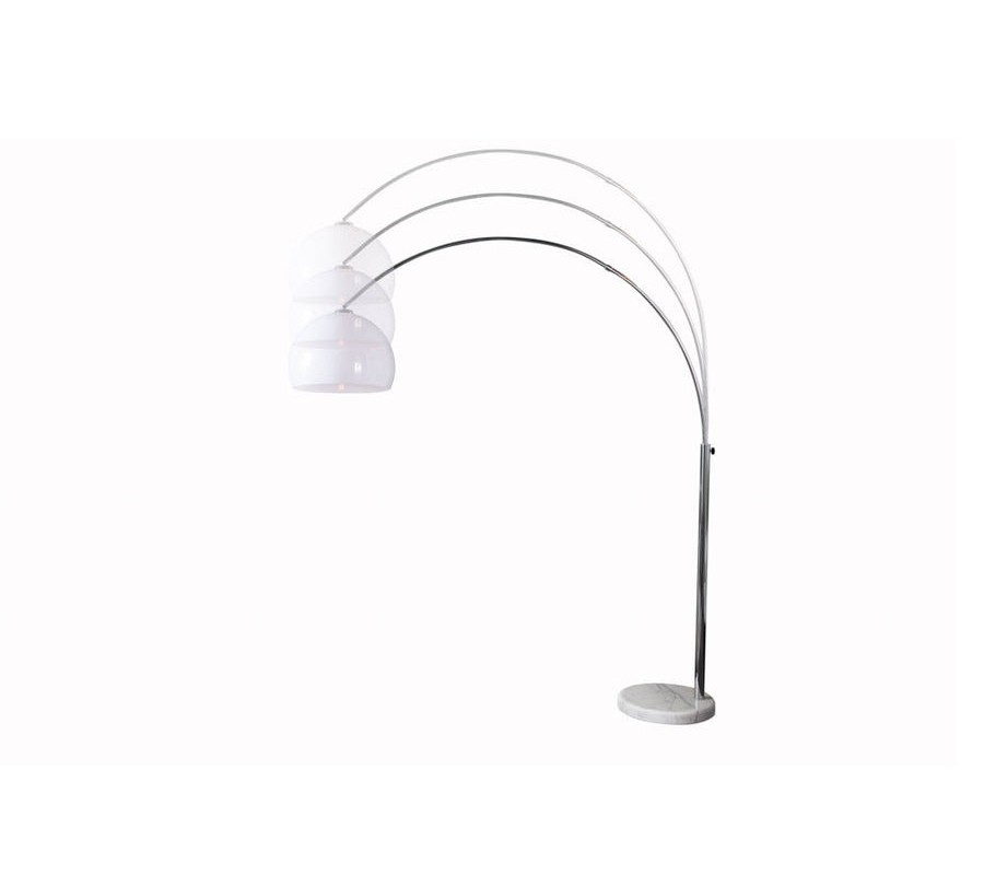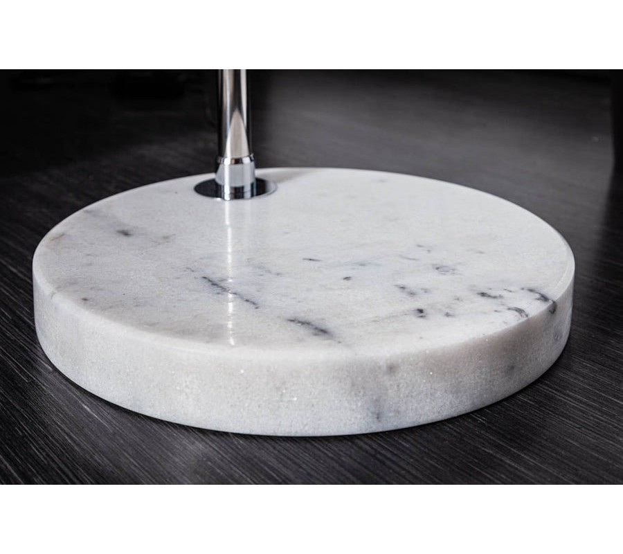 Tienidlo má okrúhly oblý tvar a je vyrobené z lesklého bieleho akrylu. Pôsobí ako moderná pologuľa, ktorá rozptyľuje svetlo mäkko a rovnomerne. Okrúhla podstava z bieleho mramoru zabezpečuje stabilitu a dodáva lampe pocit luxusu a nadčasovosti.