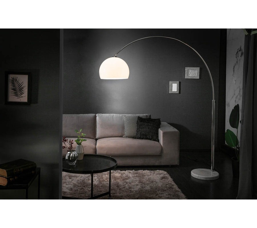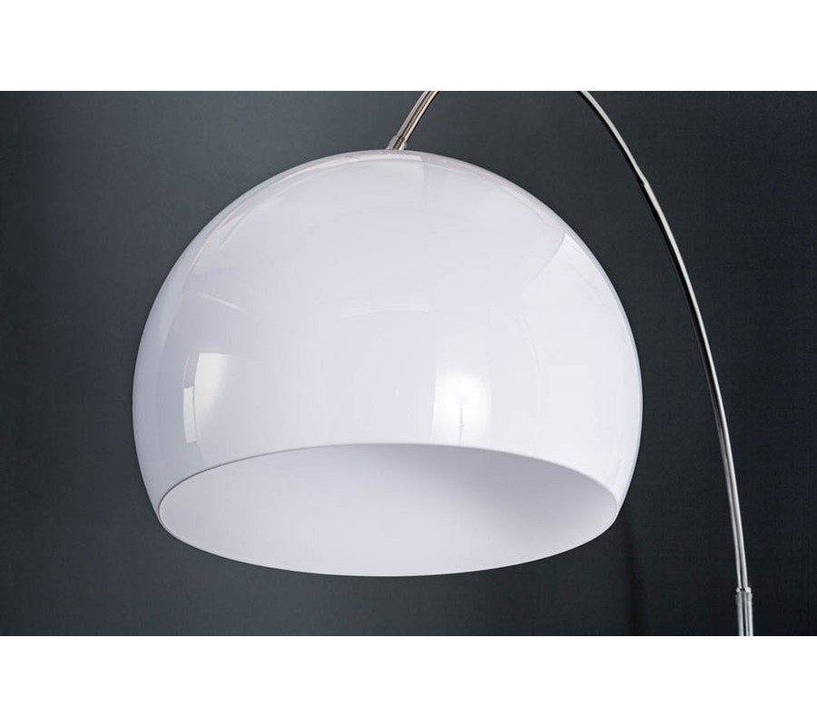 Dizajnová polohovateľná oblúková moderná kovová strieborná stojaca lampa Big Bow s bielym akrylovým okrúhlym tienidlom 205 cm