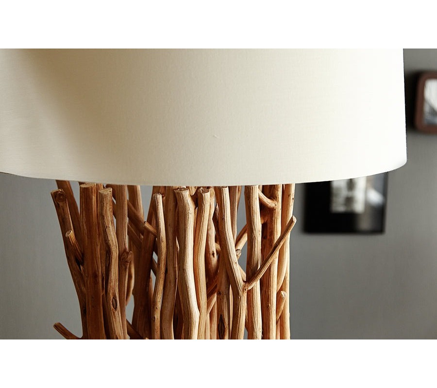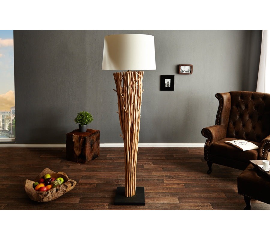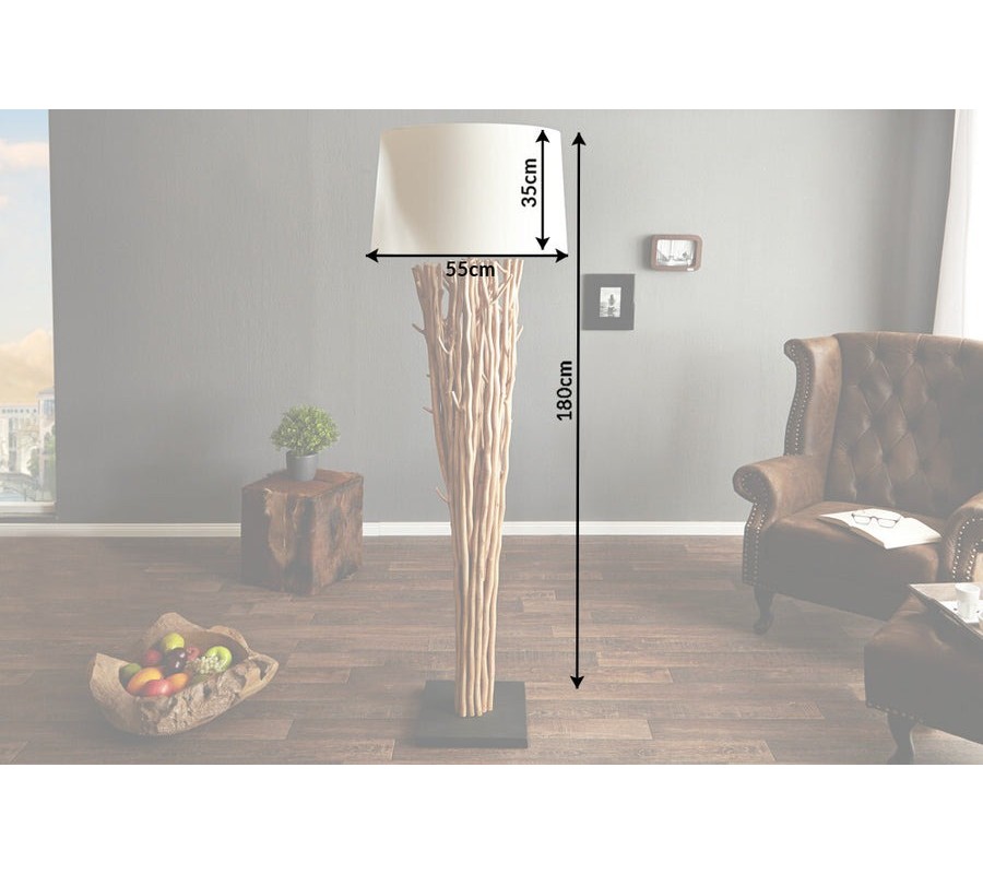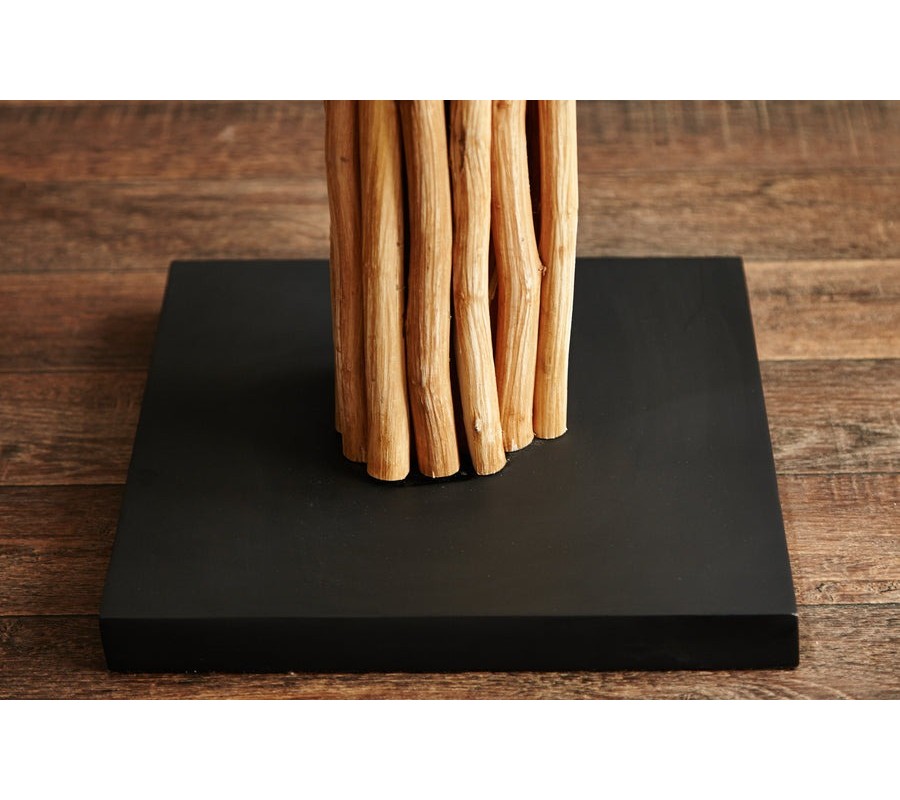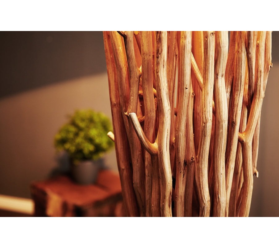 Stojaca lampa Euphoria okamžite upúta svojim netradičným etno vzhľadom a autentickým spracovaním z naplaveného dreva. Základňu lampy tvorí pevná čierna štvorcová podstava, z ktorej sa dynamicky rozvetvujú svetlé hnedé konáre, vytvárajúce prírodnú a surovú textúru. Táto nepravidelná drevená kompozícia je nielen funkčná, ale pôsobí ako sochársky prvok a dodáva lampe výtvarný rozmer.