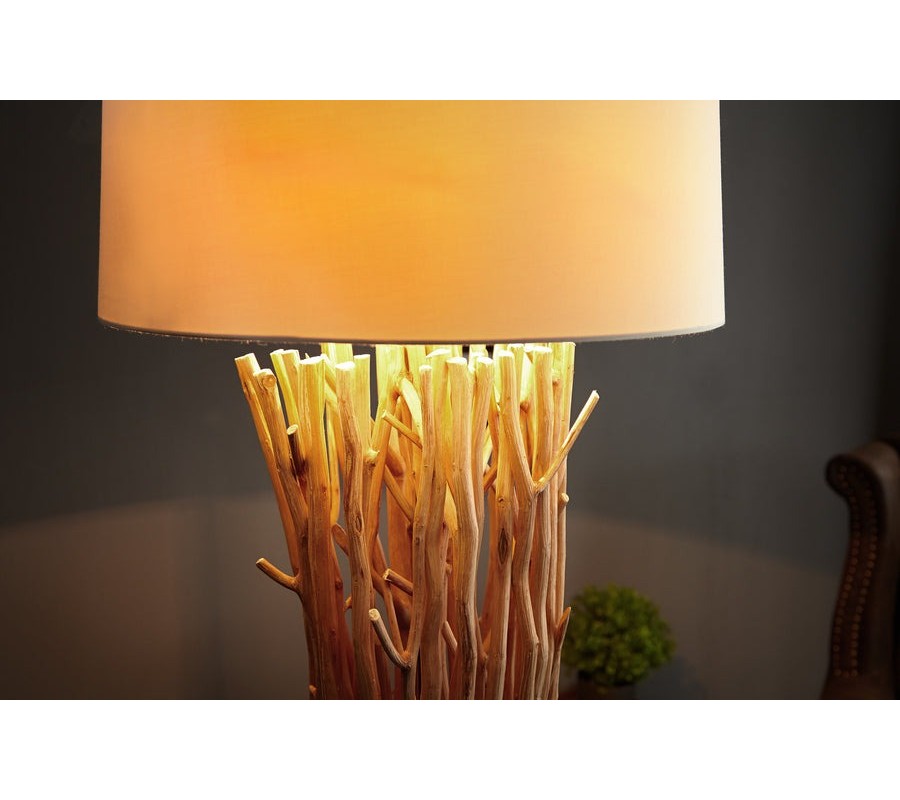Lampa je zakončená valcovým tienidlom z ľanu v jemnom krémovom odtieni, ktoré harmonizuje s prírodnou základňou a zároveň rozptyľuje svetlo do príjemne teplého tónu. Vďaka použitiu prírodných materiálov je každý kus originál a nesie v sebe jedinečný charakter tvarov a kresby dreva.