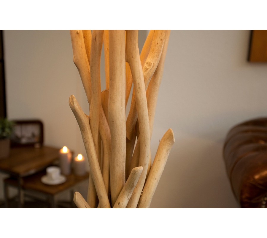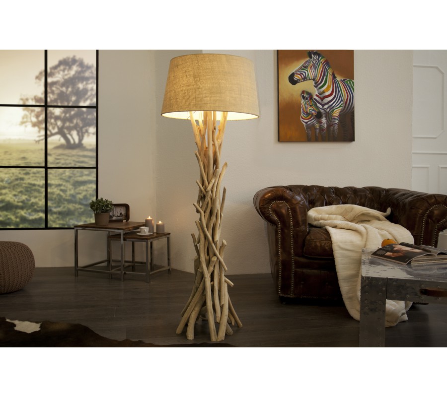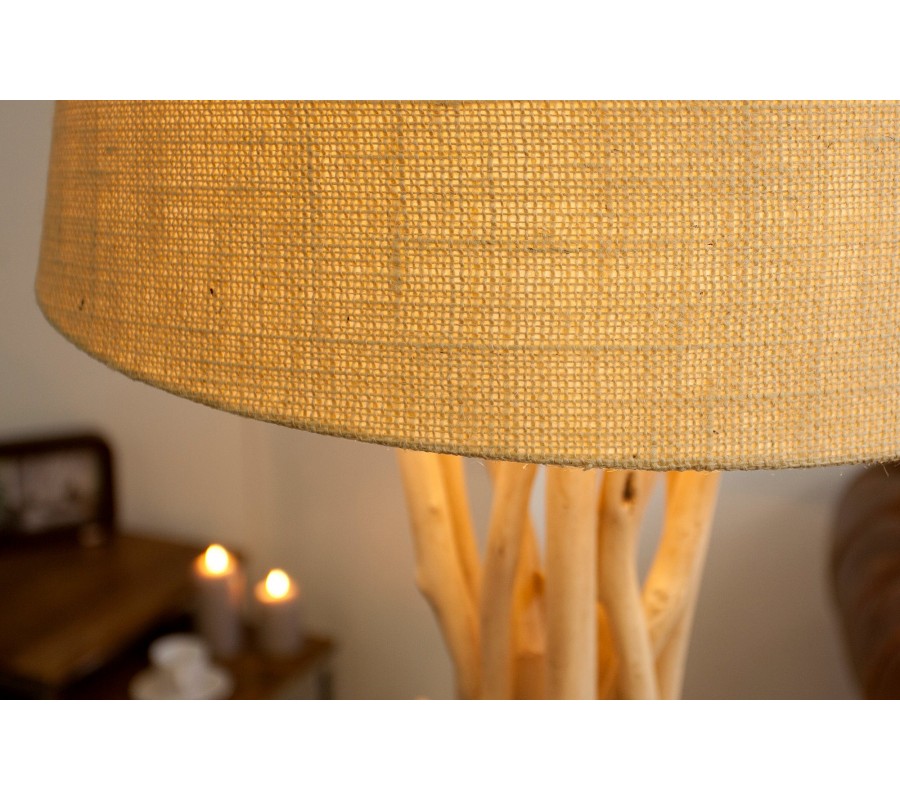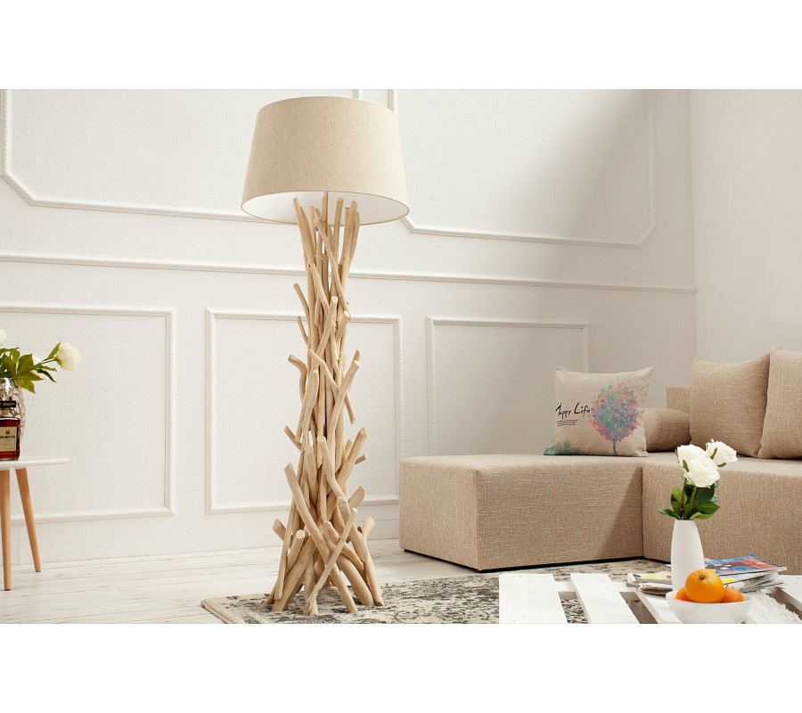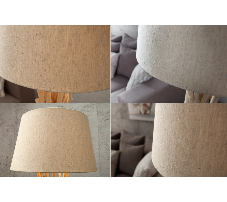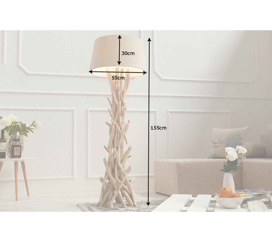 Dizajnová originálna stojaca lampa Cara Vás presvedčí dokonalou kombináciou naplaveného masívneho dreva a prírodného ľanu. Rôzne usporiadané konáriky vytvárajú jedinečný a vzrušujúci vzhľad. ľanová tkanina je nielen šetrná k životnému prostrediu, ale tiež zaujme na prvý pohľad. Teplé svetlo vytvorí príjemnú atmosféru vo Vašej domácnosti. Každá lampa je vyrobená náročnou ručnou prácou. Rozmery: Výška 155cm Celkový Ø: 50cm Výška Tienidla: 30cm Svetelný zdroj: 1xE27 max. 60W. Energetická trieda: A ++. Žiarovka nie je súčasťou dodávky.