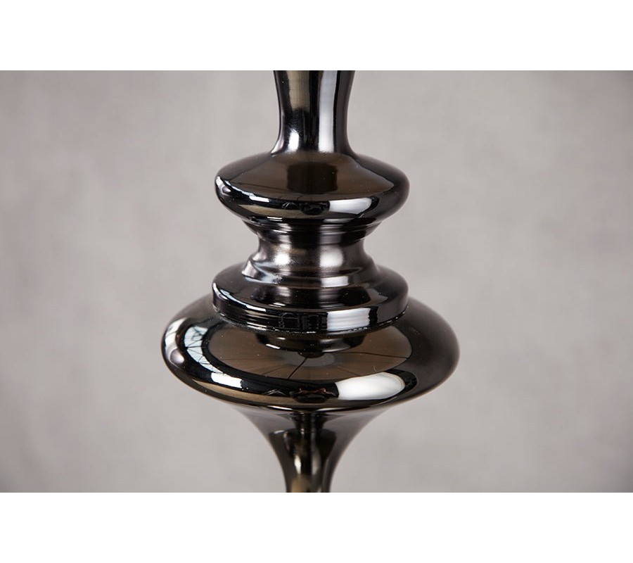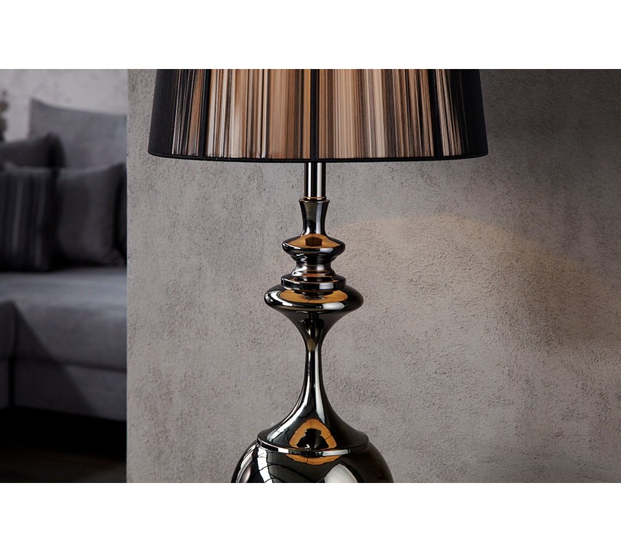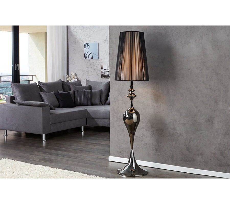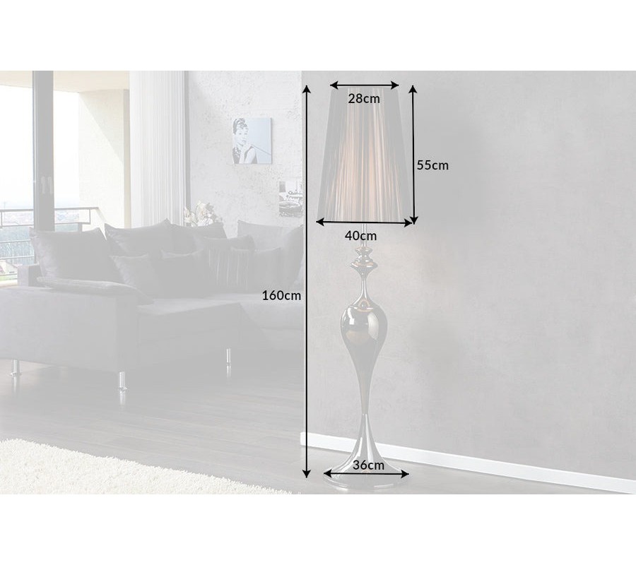 Stojaca lampa Lucie Schwarz zaujme svojím vysokým a elegantným tvarom s výrazným glamour barokovým nádychom. Konštrukcia je vyrobená z kovu s čiernym lesklým povrchom, ktorý vytvára luxusný a zároveň moderný dojem. Telo lampy má oblú siluetu, ktorá sa v strede rozširuje, potom zužuje a pri podstave sa opäť rozširuje, čím pôsobí plasticky a exkluzívne.