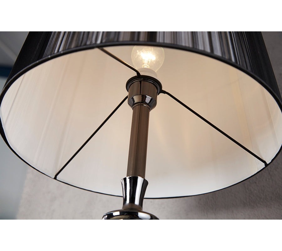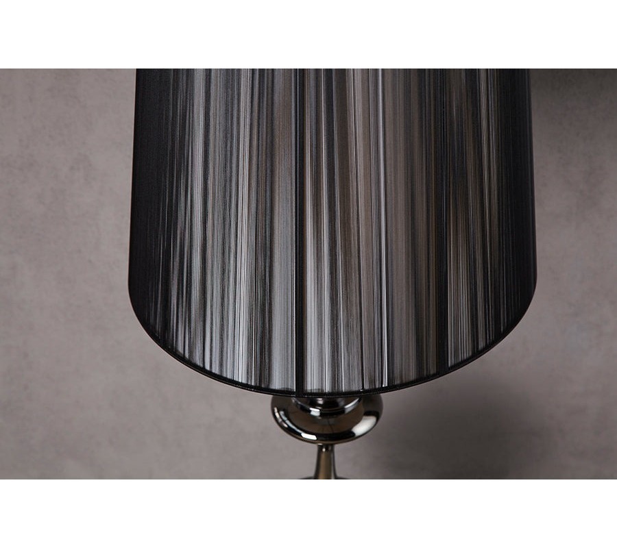 Pod tienidlom sa nachádzajú ozdobné výbežky a tvarované prechody, ktoré ešte viac zdôrazňujú detailné spracovanie celej lampy. Tienidlo je vyrobené z priesvitného čierneho nylonu s jemnými zvislými pruhmi a bielym podšitím, ktoré vytvárajú zaujímavý svetelný efekt pri rozsvietení. Tvar tienidla je vysoký a okrúhly, jemne sa zužujúci smerom nahor.
