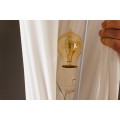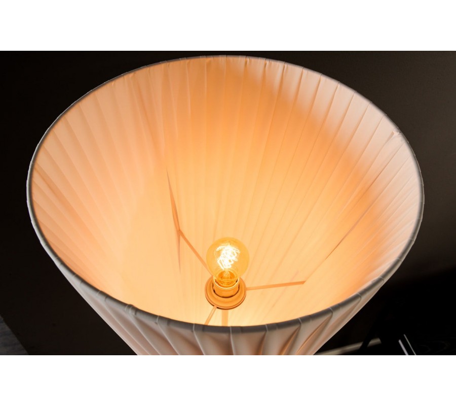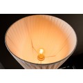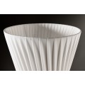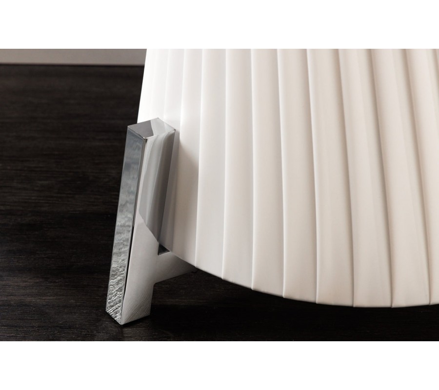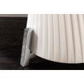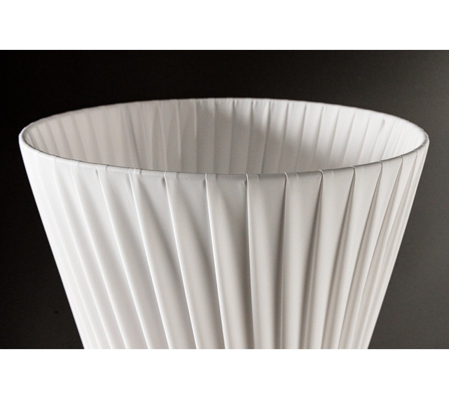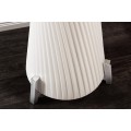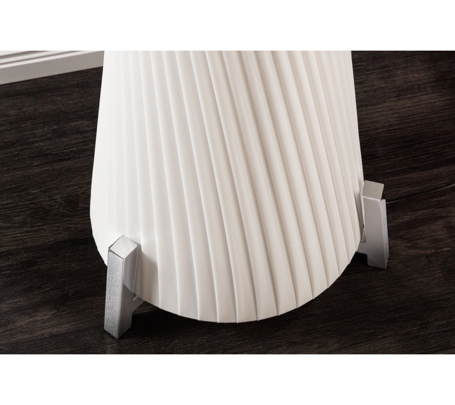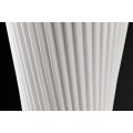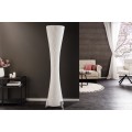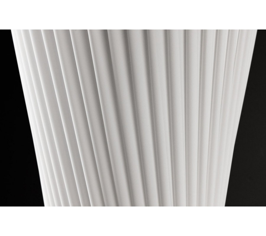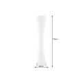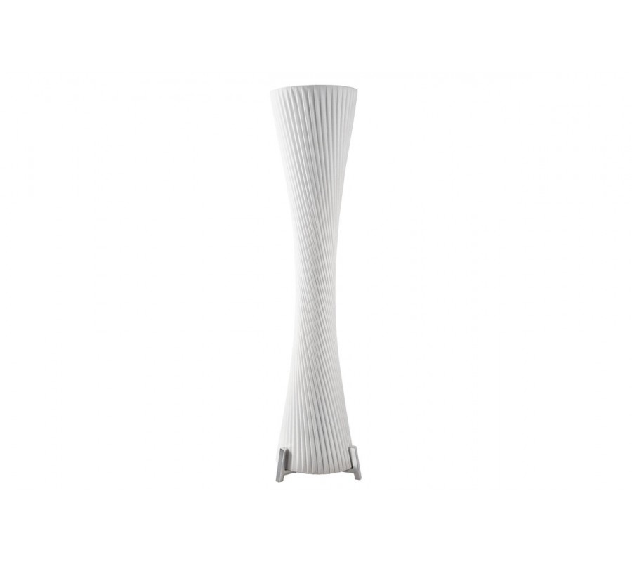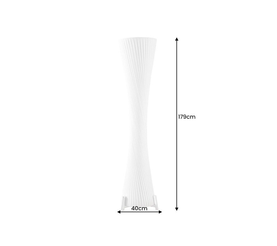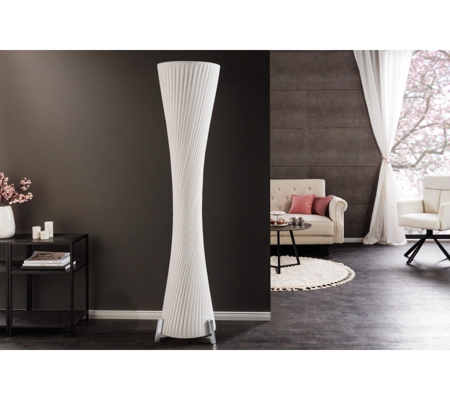Stojaca lampa Helix je moderným dizajnovým kúskom s výraznou sochárskou siluetou. Tienidlo je vyrobené z bieleho latexového materiálu, má okrúhly tvar, ktorý sa elegantne zužuje v strede, čím vytvára formu pripomínajúcu presýpacie hodiny. Povrch lampy je zdobený jemným, no výrazným špirálovým vrúbkovaním, ktoré sa pozdĺž tela elegantne stáča a zvýrazňuje ladné zatočenie celého tvaru.