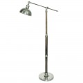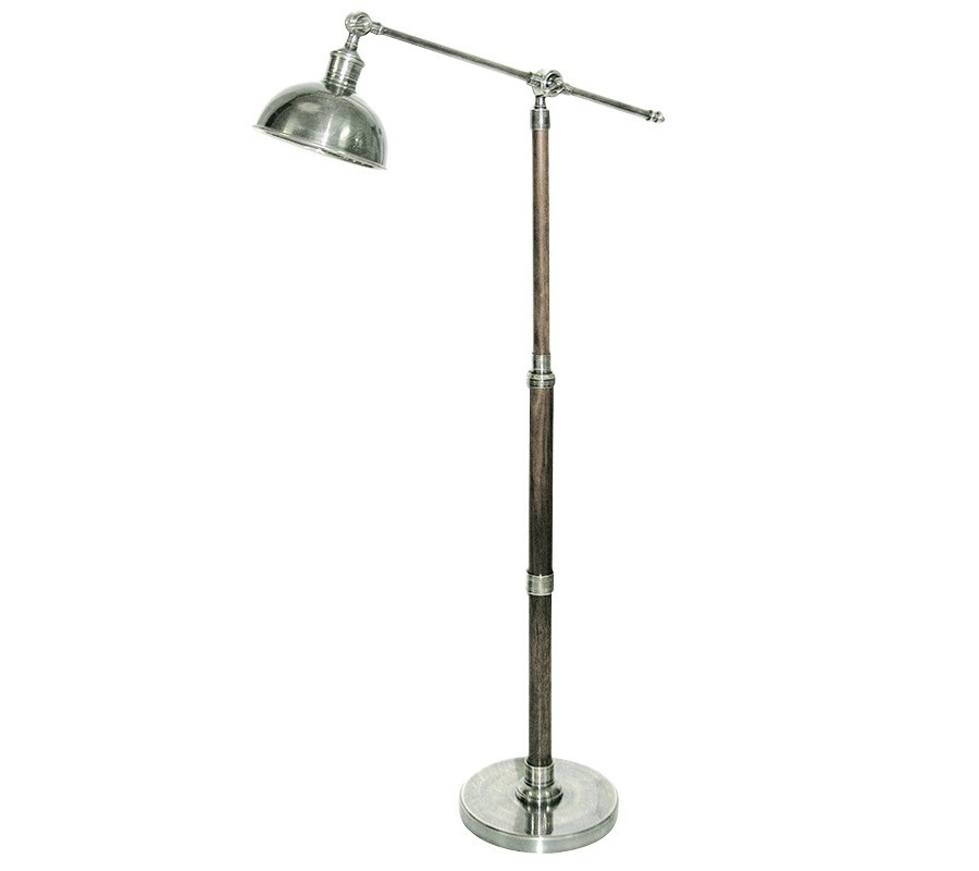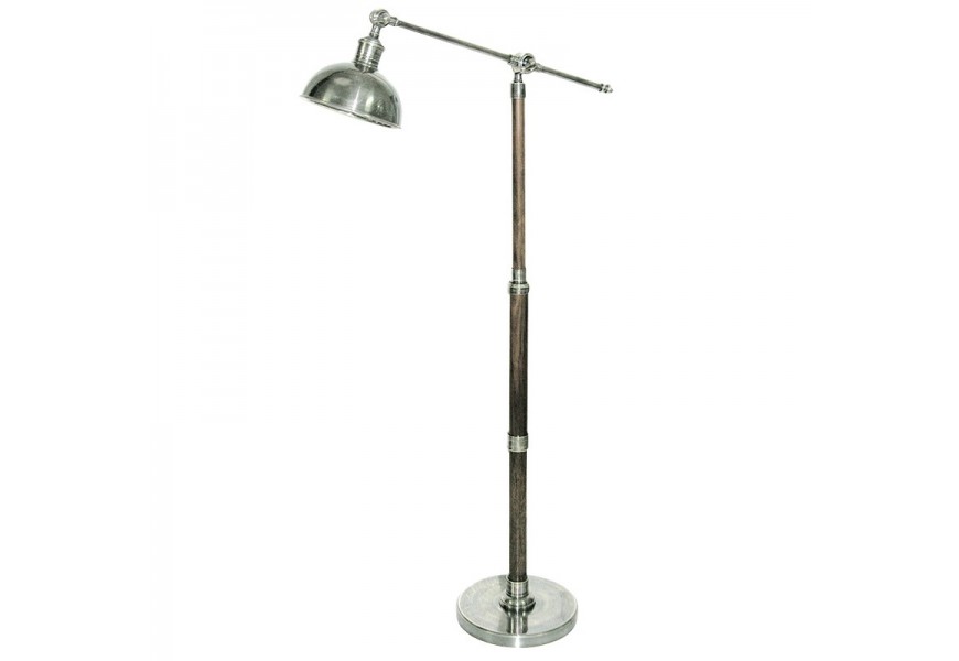 Dizajnová industriálna stojacia lampa Theo s kovovým tienidlom a dreveným stojanom výškovo nastaviteľná strieborná 152 cm