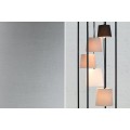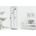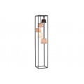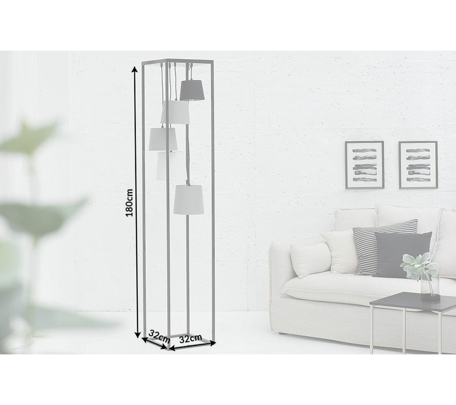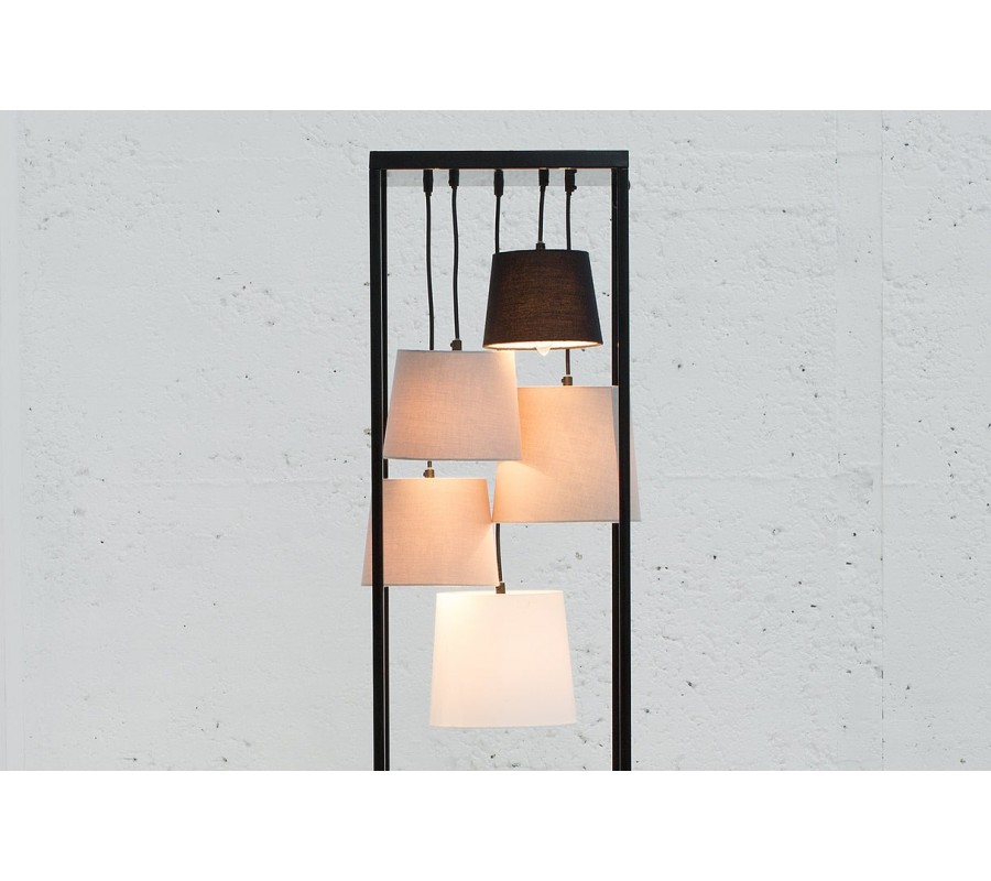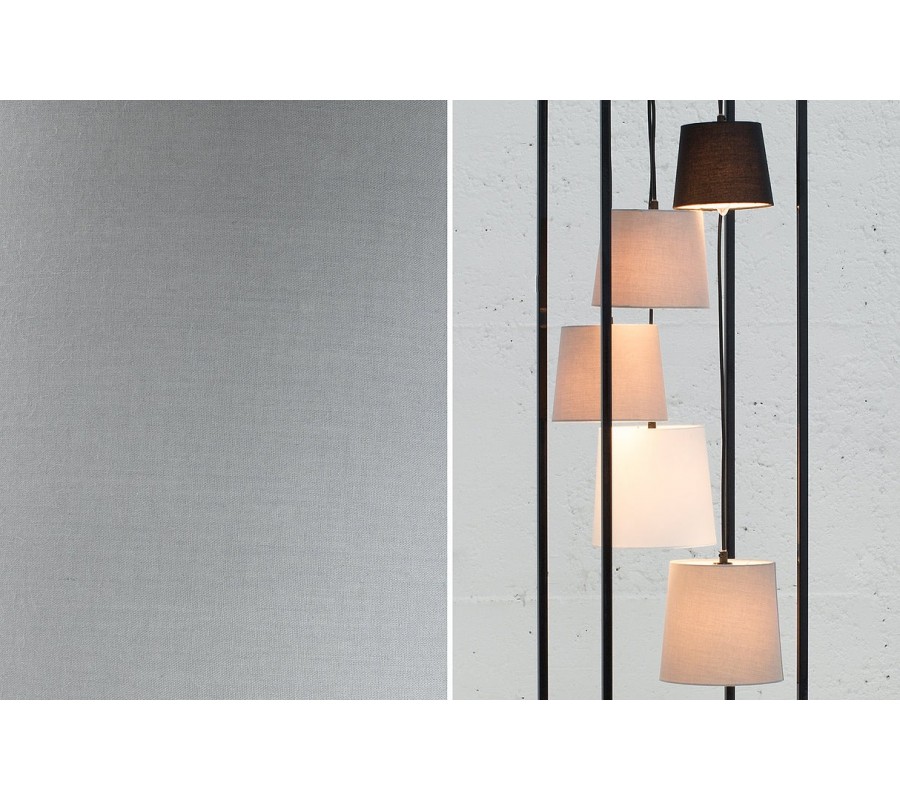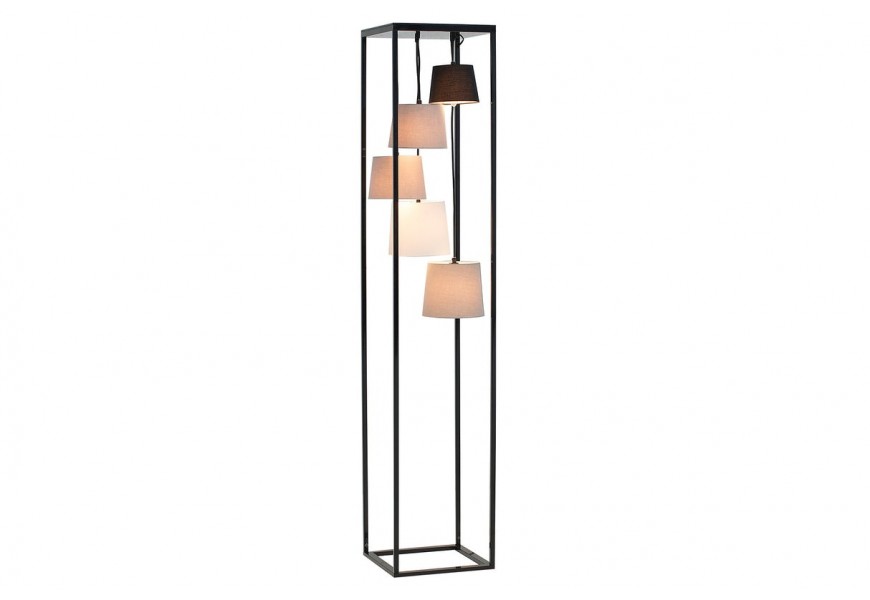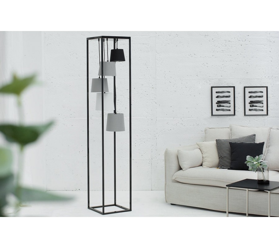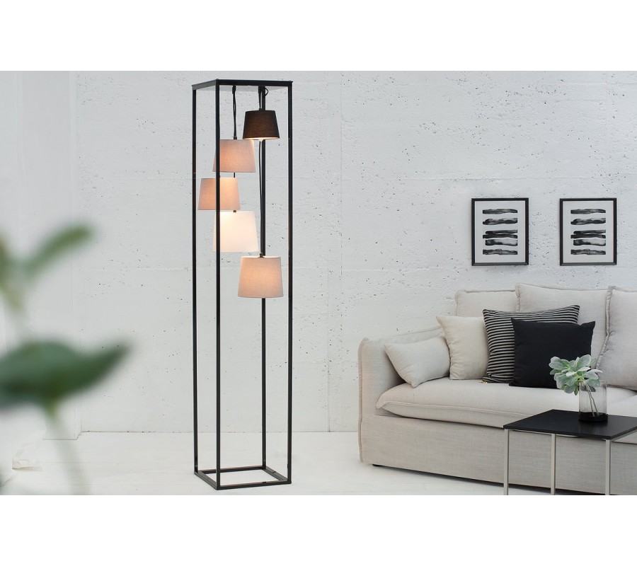 Stojaca lampa Levels v industriálnom štýle zaujme svojou vysokou obdĺžnikovou konštrukciou z čierneho kovu s otvoreným rámom. Vnútorný priestor tohto rámu vypĺňa zoskupenie piatich ľanových tienidiel v rôznych farebných tónoch – tri sivé, jedno čierne a jedno biele – ktoré sú zavesené v rôznych výškach.