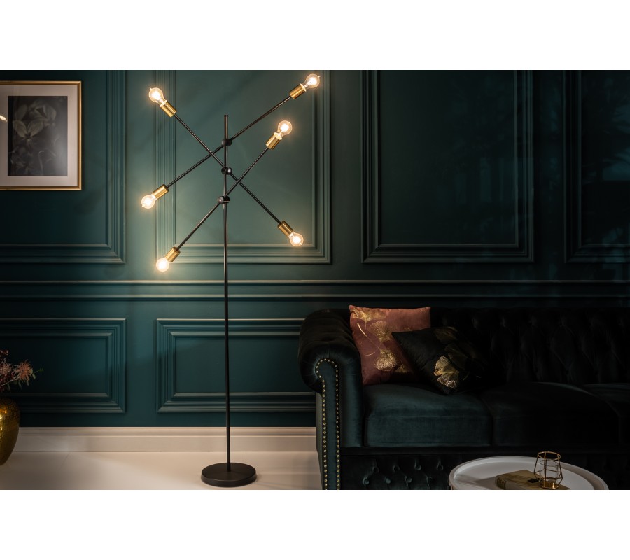 Rafinovaný dizajn stojacej lampy Elke spočíva v kombinácii minimalistického tvaru a nadčasového kovového materiálu. Konštrukcia z kovu je doplnená elegantnou čiernou povrchovou úpravou s výnimočnými detailmi v luxusnom zlatom odtieni, ktoré lampe dodávajú štýlový pôvab. Vysoká podstava nesie trojicu otočných ramien, ktoré sú ukončené spolu až šiestimi žiarovkami. Okrem moderných interiérov sa lampa Elke stane dokonalým doplnením rozličných priestorov s prvkami industriálneho či dokonca Art-deco štýlu. K svietidlu odporúčame žiarovky typu E27 s maximálnym výkonom 40W, ktoré nie sú súčasťou balenia.