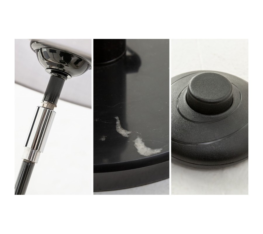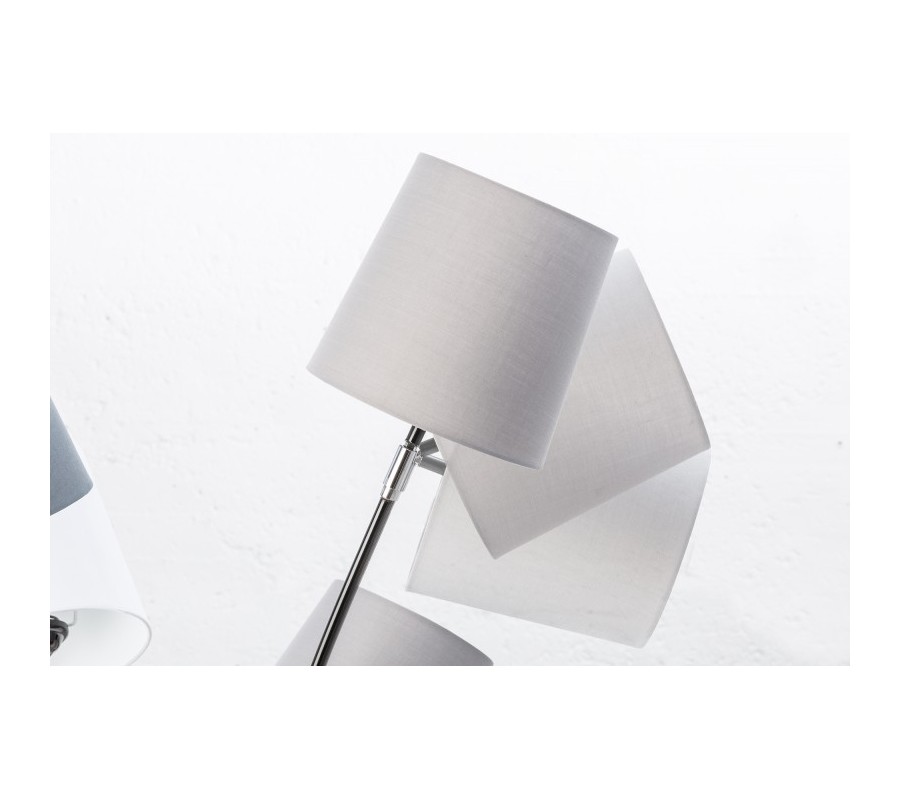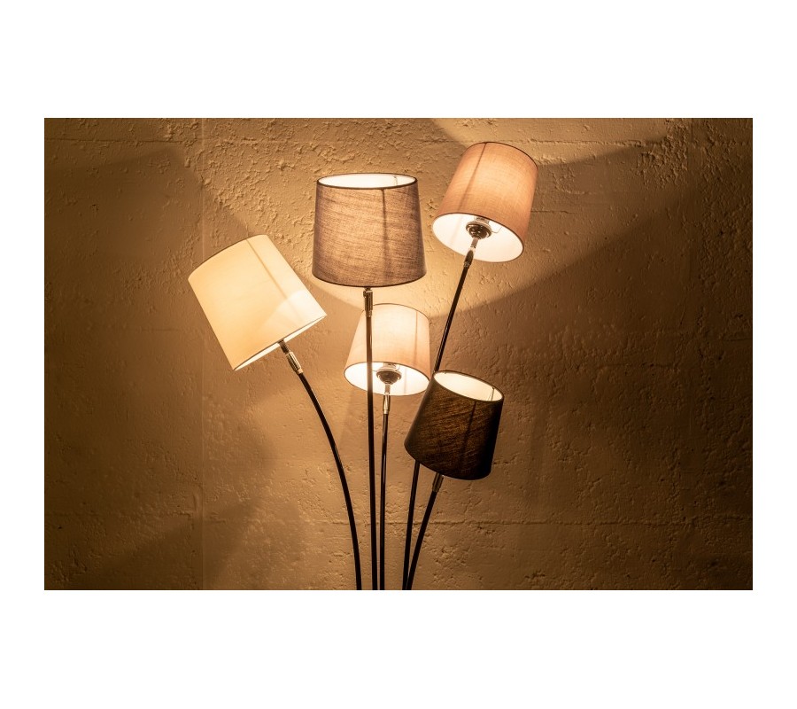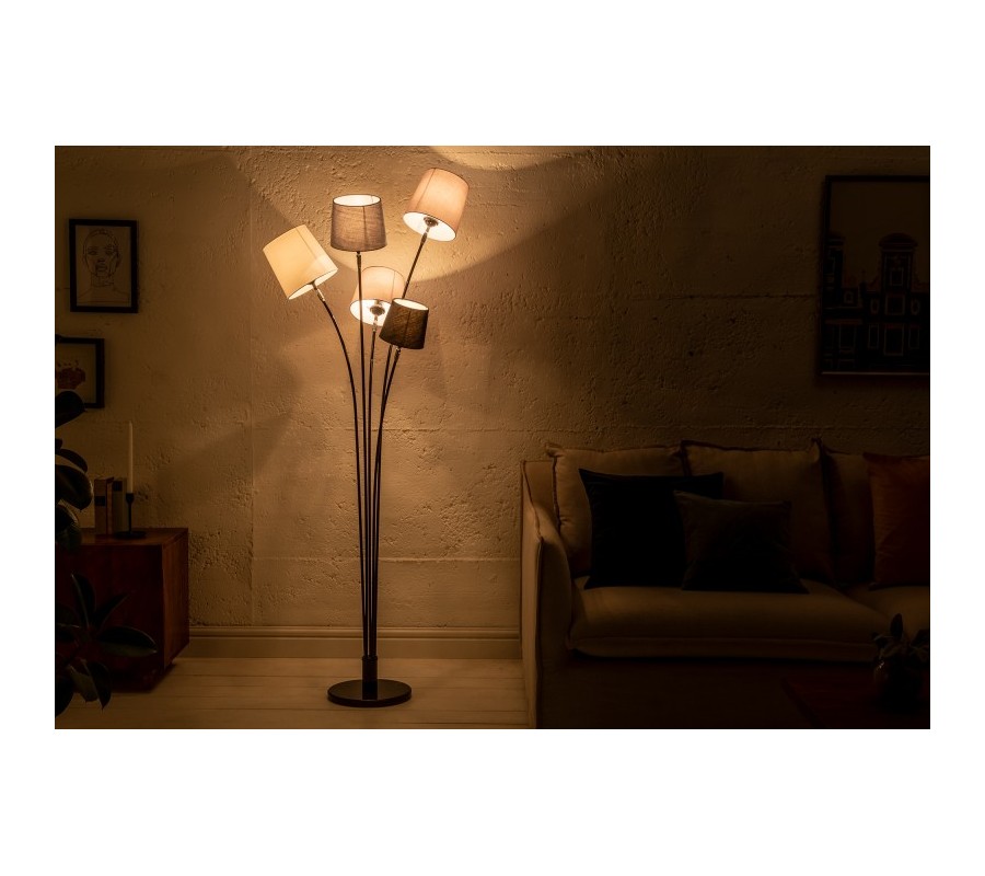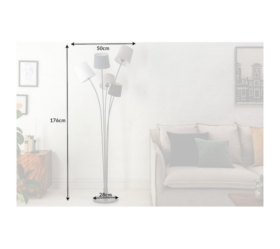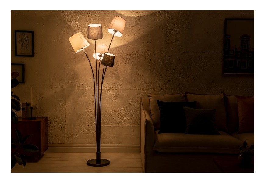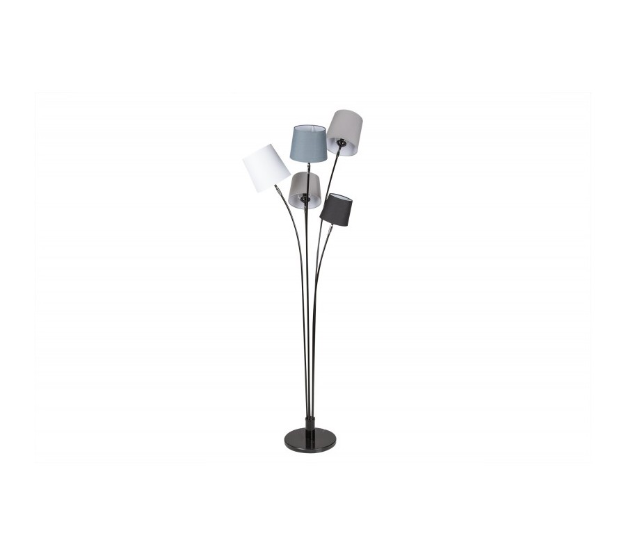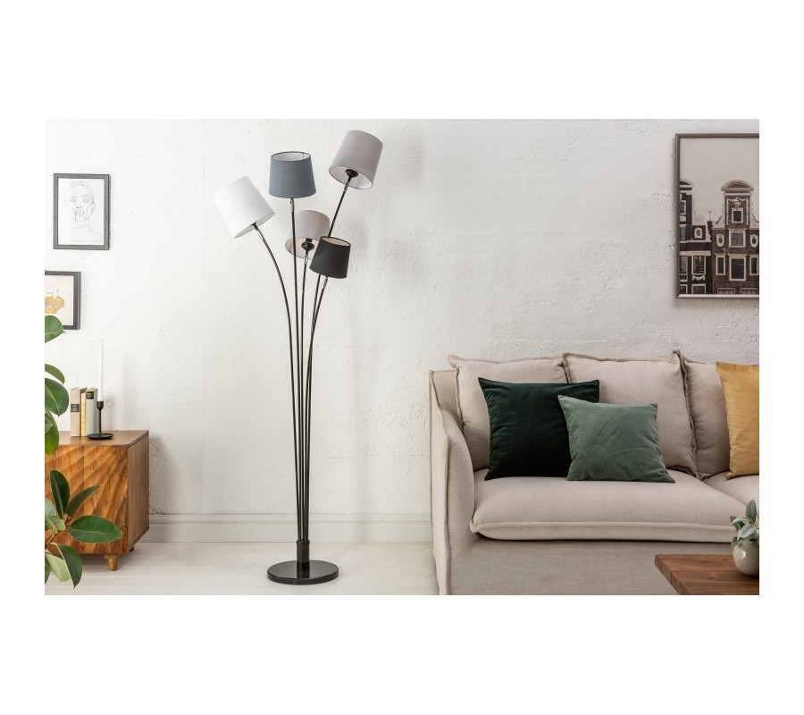 Dizajnová stojaca lampa Elegans je štýlovým doplnkom každého moderného interiéru. Je zaujímavá predovšetkým vďaka svojmu jedinečnému prevedeniu, ktoré tvorí kovová konštrukcia čiernej farby s piatimi svietidlami. Tienidlá sa nesú v bielej, sivej a čiernej farbe, čo tvorí elegantný monochromatický vzhľad. Lampa Elegans zapadne do každej moderne ladenej obývačky, pracovne či spálne ladenej v svetlejších i tmavších odtieňoch. Dokonalý dojem dosiahnete kombináciou so svetlou sedačkoua masívnym nábytkom.