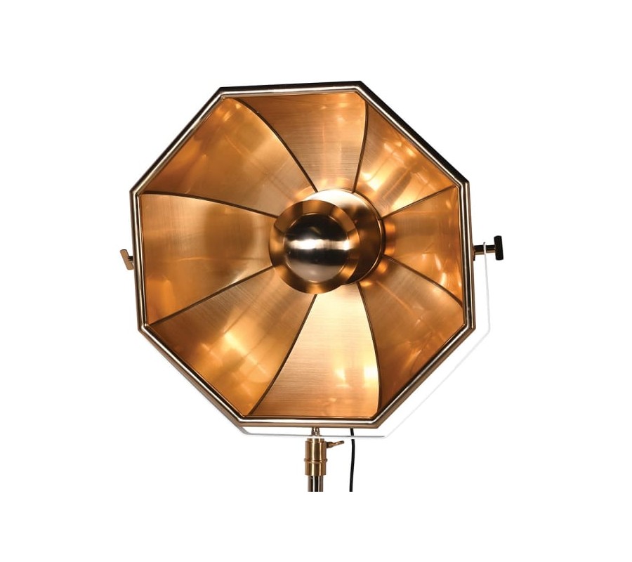 Štýlová stojaca lampa ladená do industriálneho štýlu jednoznačne zaujme nejedného návštevníka Vašej domácnosti. Lampa sa skladá z unikátneho tienidla tvarom pripomínajúceho dáždnik, ktorého vnútorná strana je ladená do medenej farby, zaručujúc tak lepšie osvietenie okolia a vonkajšia strana je pokrytá svetlobéžovou textíliou. Tienidlo je osadené v pohyblivom ráme medenej a bielej farby, umiestnenom na kovovom medeno-bielom stojane disponujúcom troma nožičkami, ktoré zabezpečujú nastaviteľnosť celkovej výšky lampy. Lampa sa bude vynikajúco vynímať v industriálne ladených interiéroch a vďaka svojmu lesklému prevedeniu v kombinácii so sýtymi farbami je vhodná aj na umiestnenie v art-deco interiéroch.