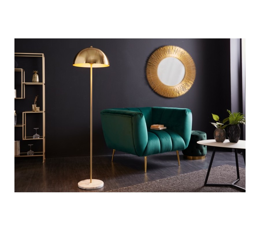 Záblesk modernej funkčnosti a art deco umeleckého nádychu sa snúbi v minimalistickom prevedení stojacej lampy Jaspeado. Lampa pozostáva zo zlatej lesklej kovovej tyčovitej konštrukcie s tienidla v okrúhlom prevedení. Konštrukcia je ukotvená v rovnako okrúhlej postave v mramorovom bielom vyhotovení. Tento štálový kúsok bude skvelým doplnkom do vašej domácej knižnice, pracovne či moderne art deco ladenej obývačky. Vynikne aj v menších miestnostiach, ktoré krásne rozžiari v kombinácii so svetlými teplými odtieňmi hnedej, koralovej, krémovej či zelenej. Umiestniť ju je vhodné pri čalúnené art deco kreslo v zamatovom prevedení a k huňatému svetlému béžovému kobercu položenému na tmavšej (napríklad parketovej) podlahe, aby mohol krásne vyniknúť mramorový podstavec lampy Jaspeado.