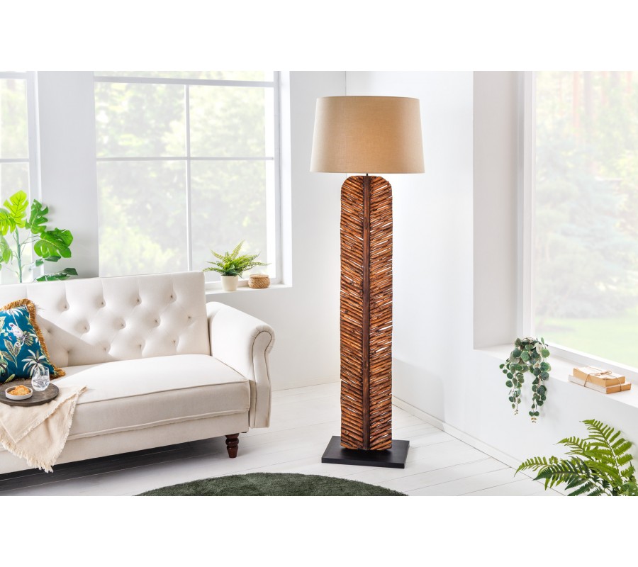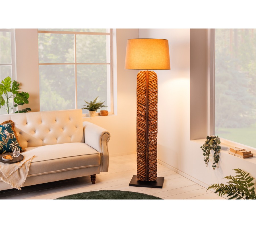 Dizajnová stojaca lampa Elegia s prírodnou hnedou podstavou a béžovým tienidlom 180cm