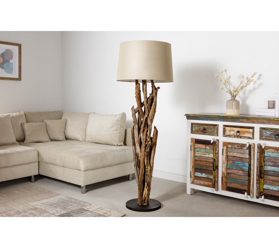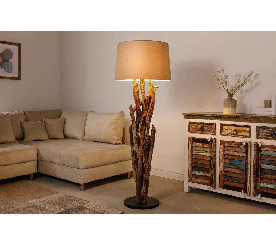 Stojaca lampa Pole vás uchváti divokou krásou naturálneho dreva. Do vašej domácnosti vnesie nespútaný prírodný prvok vďaka podstave z teakového dreva. Jej dizajn zachováva prirodzený vzhľad a štruktúru tohto materiálu v úchvatnej siluete prepletených konárov v naturálnych hnedých odtieňoch. Každý produkt je jedinečný originál vyrobený s rešpektom k vlastnostiam dreva a preto sa jednotlivé kusy od seba líšia. Vďaka tomu budete mať doma unikátne svietidlo s neopakovateľným dizajnom. Teplé odtiene dreva výborne dopĺňa okrúhle tienidlo v svetlej béžovej farbe. Jeho jednoduchý dizajn zároveň necháva naplno vyniknúť divokú krásu podstavy. Lampa je umiestnená na okrúhlej kovovej podstave s prívodovým káblom v čiernej farbe. Je potrebná žiarovka typu E27 s maximálnym príkonom 40 wattov, ktorá nie je súčasťou balenia. Stojaca lampa Pole je ideálnym doplnkom do priestorov zariadených vo vidieckom štýle, do ktorých vnesie čaro prírody. V kombinácii s kreslom so vzorovaným či patchworkovým čalúnením a príručným stolíkom z masívneho dreva tak vytvoríte magické zátišie na relaxáciu či posedenie pri knihe. Môžete ju tiež umiestniť do obývačky alebo jedálne, ako akcentový prvok, kde bude nie len zdrojom príjemného atmosférického osvetlenia, ale tiež výrazným dekoračným prvkom. Jej prírodný charakter môžete ešte zvýrazniť pridaním živých zelených rastlín a kombináciou s nábytkom z masívneho dreva.