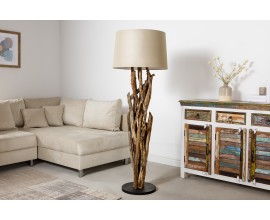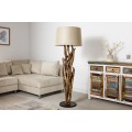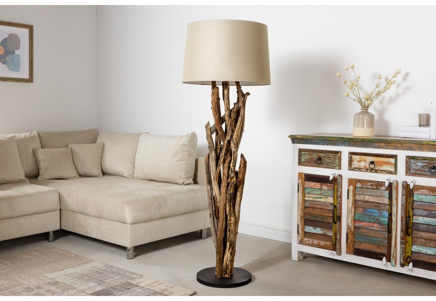 Luxusná vidiecka stojaca lampa Pole s naturálnou hnedou podstavou z teakového dreva a s béžovým tienidlom 150 cm