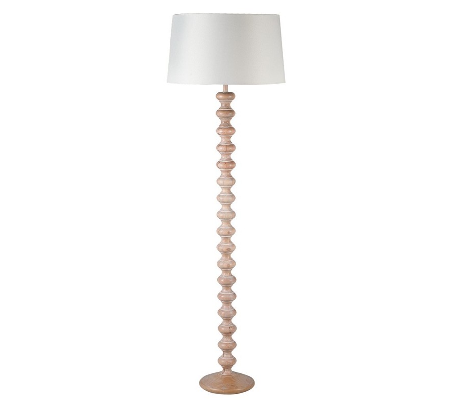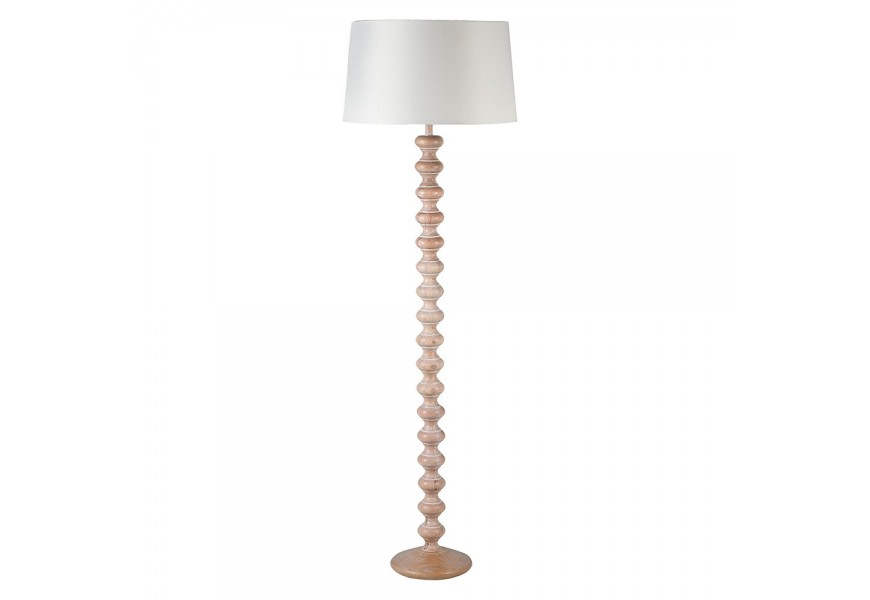 Dizajnová stojaca lampa Tini s bielym kužeľovým tienidlom a dlhou drevenou vyrezávanou nohou 155 cm
