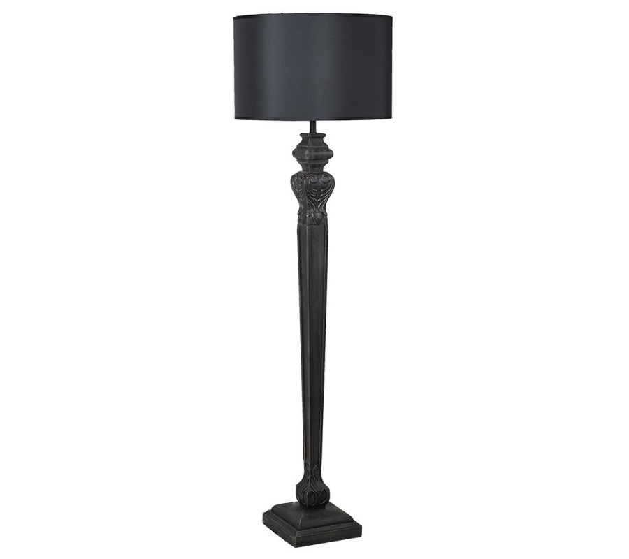 Štýlová vintage čierna stojaca lampa Samir s oválnym tienidlom a vyrezávanou nohou 157 cm