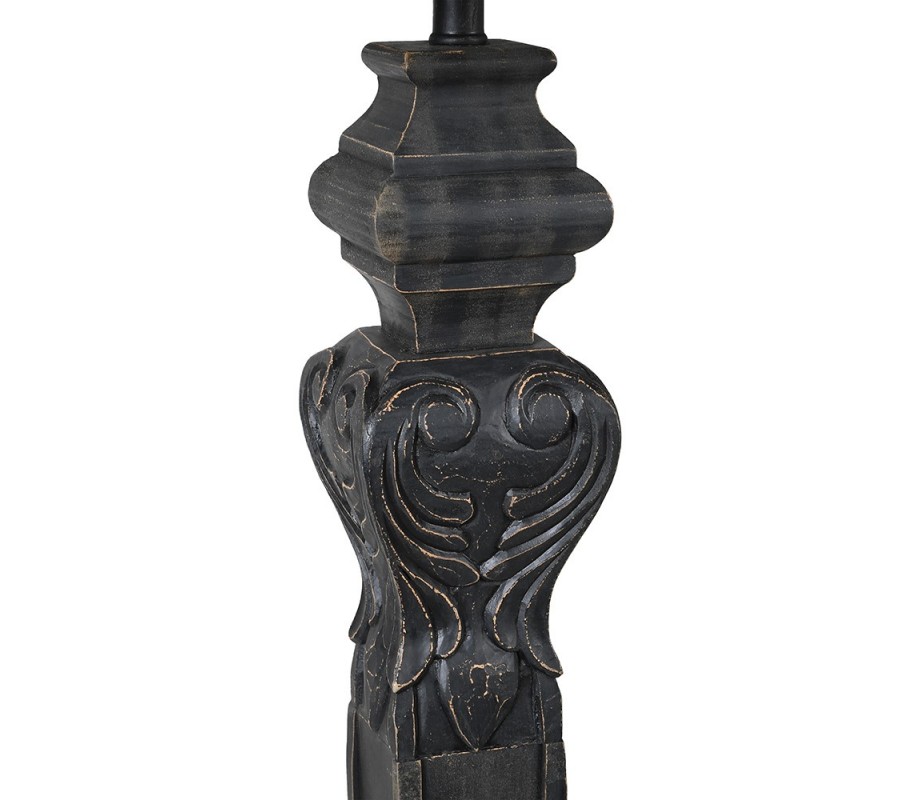 Štýlová stojaca lampa Samir je okúzľujúci kúsok do spálne, obývačky či pracovne. Noha lampy je vyrobená z masívneho deva v čiernej farbe s jemne lesklým hladkým povrchom a vyrezávanými detailmi. Hrany nohy lampy a aj hrany jej vyrezávanej výzdoby majú ošúchaný vzhľad, čo dodáva lampe zámerný efekt opotrebenia typicky pre vintage štýl. Pri tienidle sa nachádza vyrezávanie s motívom anjelských krídel a smerom nadol sa noha zužuje. Na spodu má štvorcovú podstavu, ktorá zabezpečuje lampe stabilitu. Tienidlo má tvar valca s čiernym poťahom.