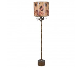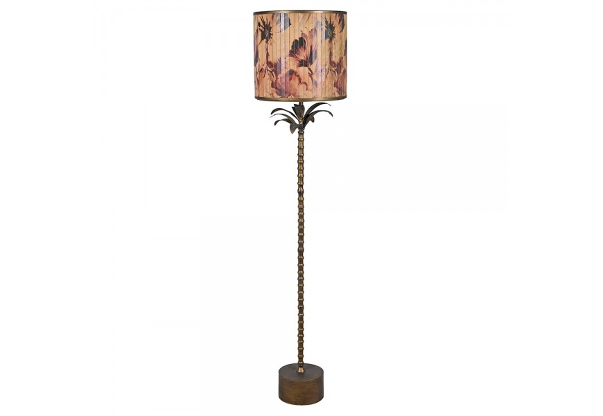 Dizajnová vintage stojaca lampa Gion s bambusovým tienidlom s akvarelovými florálnymi motívmi a nohou v zlatej farbe 151 cm