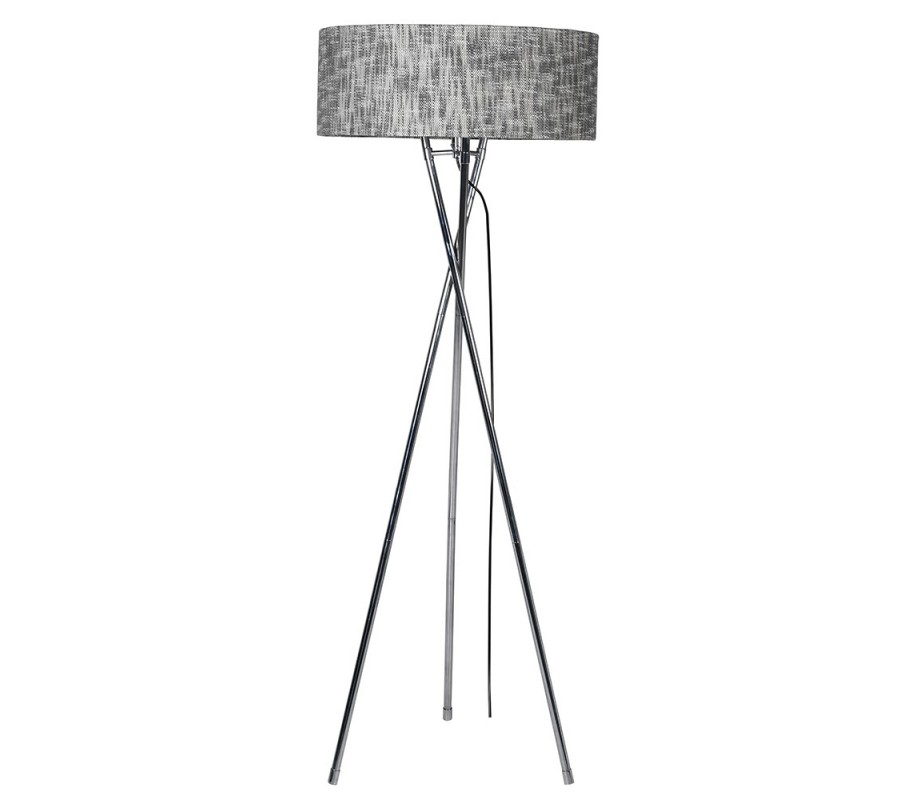 Štýlová vysoká lampa má minimalistický tvar s trojnožkovým podstavcom, ktorý pôsobí vzdušne a elegantne. Základňa je kovová, lesklá, v striebornom prevedení, pričom tienidlo je valcového tvaru a vyrobené z textilu. Povrch tienidla má jemný vzor pripomínajúci nepravidelné textúry v sivých a čiernych odtieňoch.