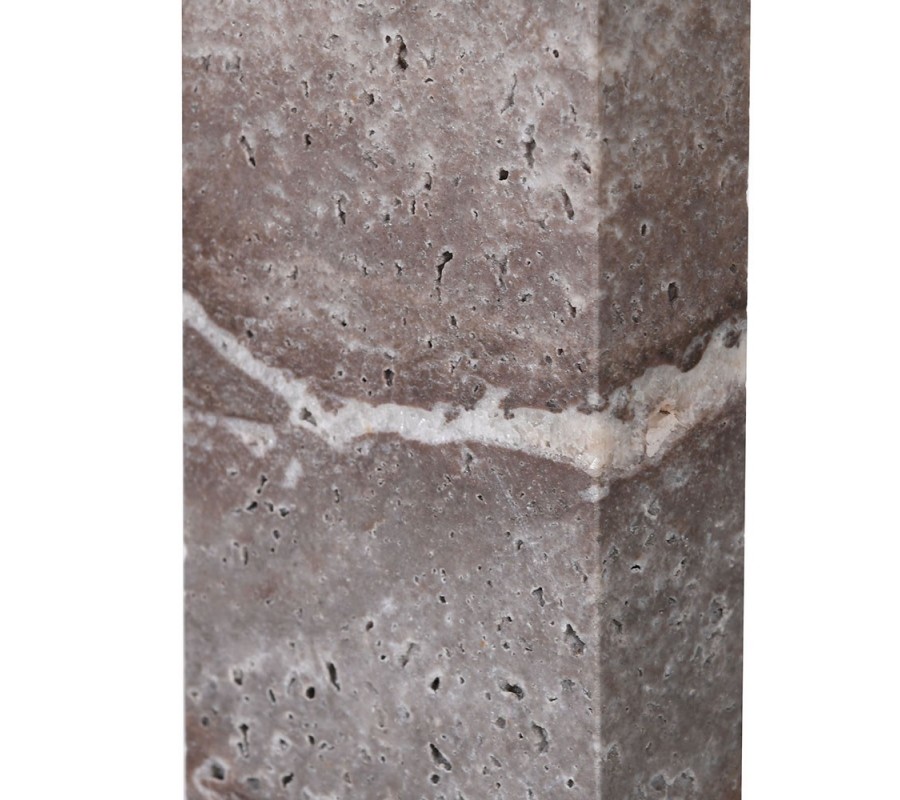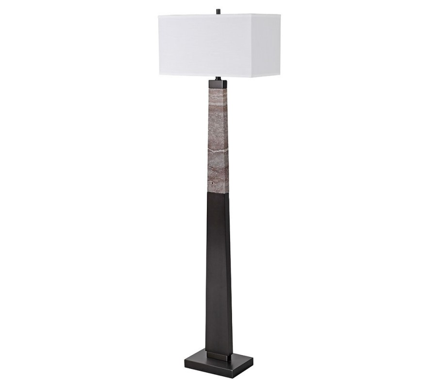 Stojaca lampa kombinuje moderné materiály a elegantný dizajn. Noha pozostáva z kombinácie kovu a mramoru. Spodná časť z kovu má tmavý, hladký povrch v matnej čiernej farbe, zatiaľ čo horná časť z mramoru má prirodzenú textúru v odtieňoch sivej a jemnej fialkovo ružovej. Mramorová časť má mierne zúžený hranatý tvar, ktorý dodáva lampe vizuálnu dynamiku a eleganciu.