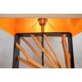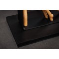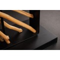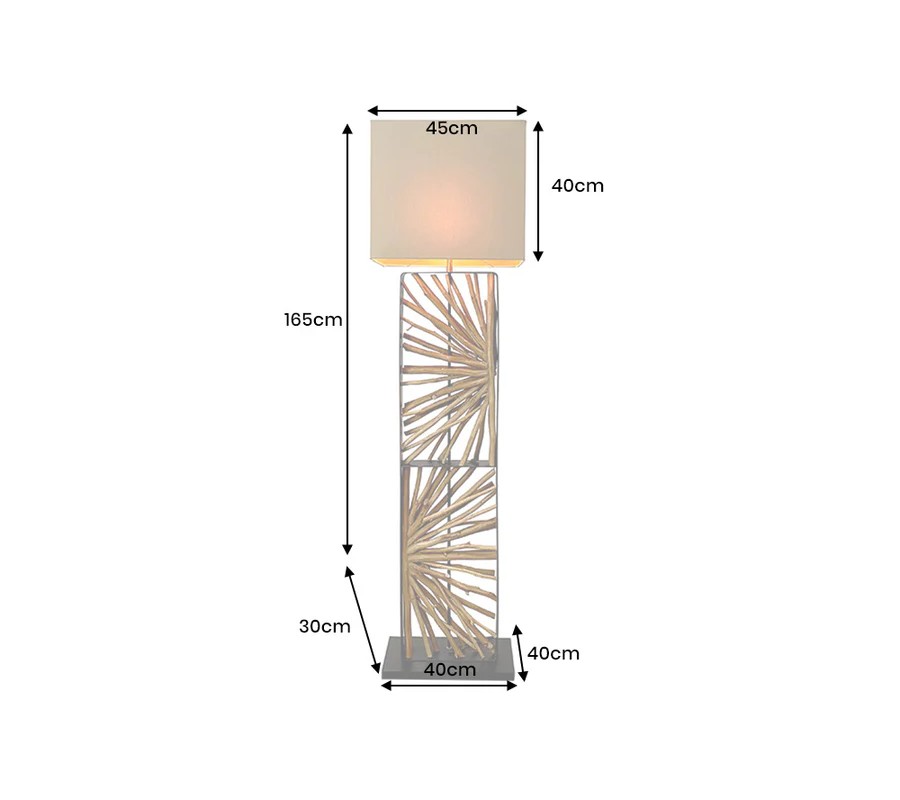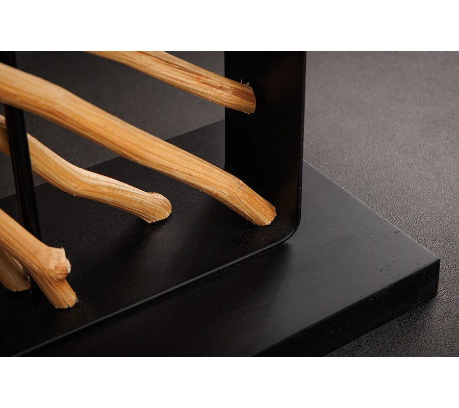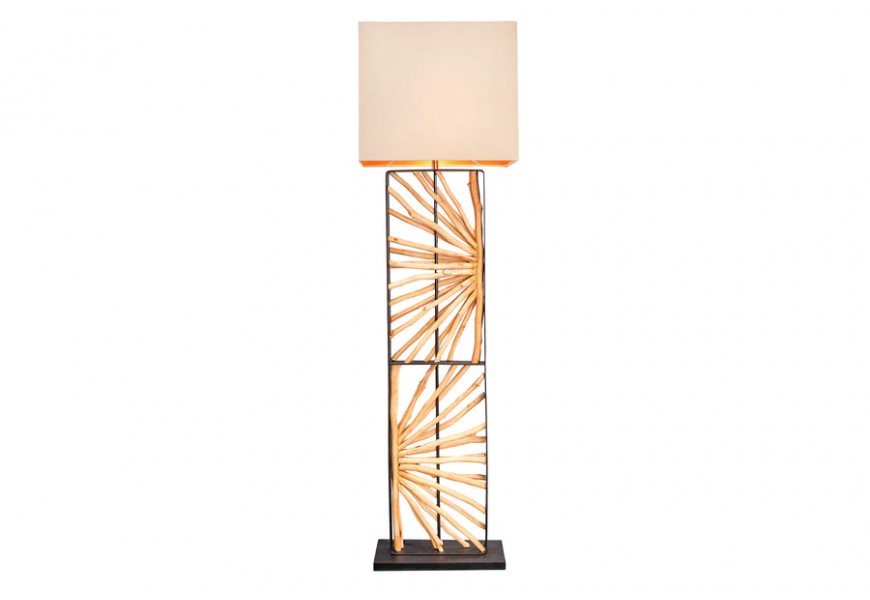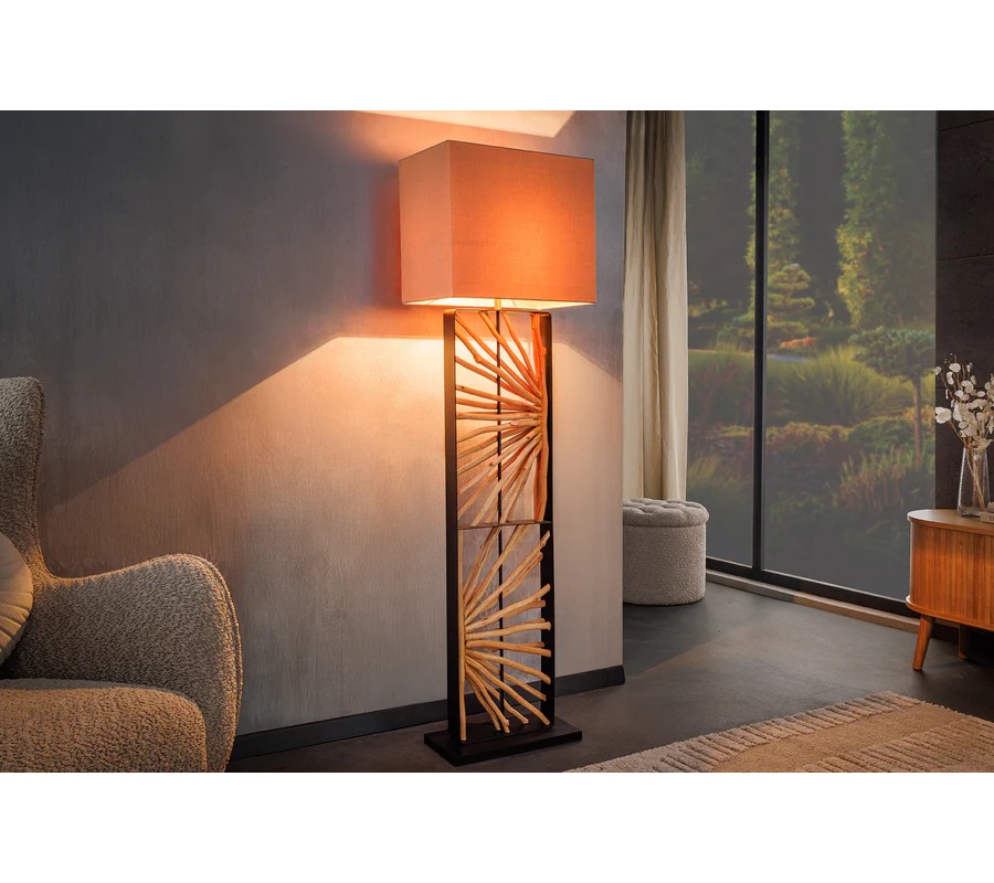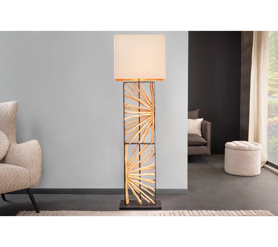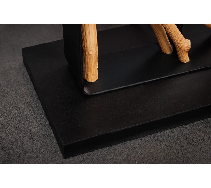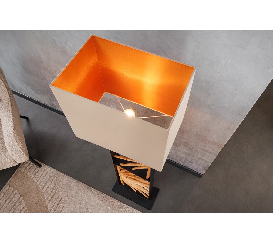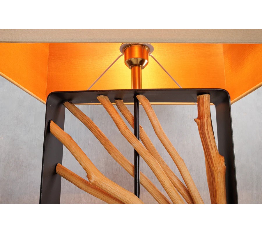 Dizajnu dominuje široká noha, ktorú tvorí obdĺžnikový kovový rám. V strede je predelený na dve časti, ktoré vypĺňajú dekoratívne prvky z dreva longan v naturálnej svetlej hnedej farbe. Drevené vetvy sú organizované do kompozície slnečných lúčov a ich organické línie dodávajú každému kusu originálny vizuál. Noha lampy je ukončená nízkym obdĺžnikovým podstavcom v rovnakom čiernom kovovom prevedení ako rám, ktoré pôsobí moderným dojmom.