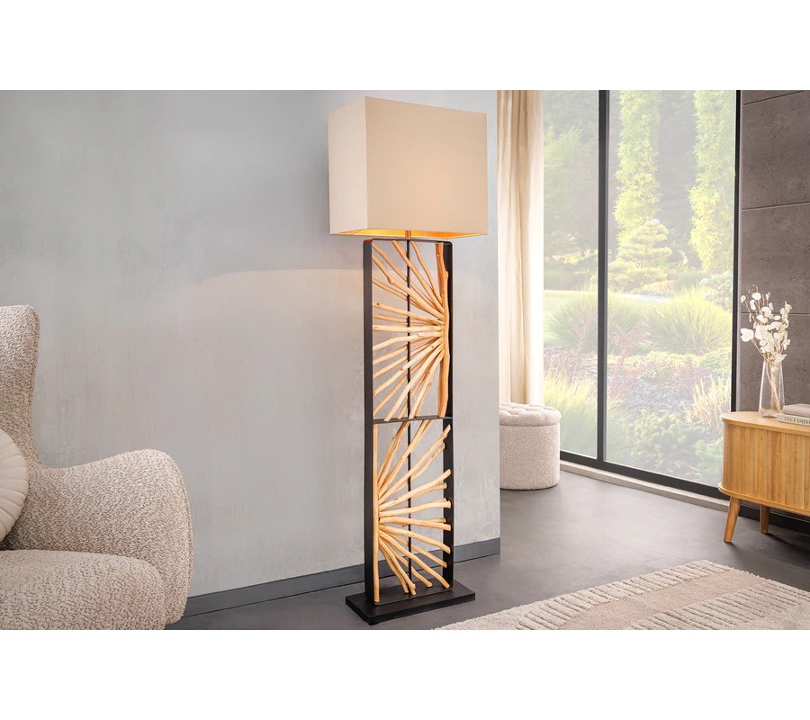 Stojaca lampa Adduro spája moderný dizajn s naturálnym etno štýlom. Elegantná farebná paleta svetlých odtieňov je obohatená o výrazný čierny akcent a toto funkčné svietidlo je tak aj pôvabnou dekoráciou.