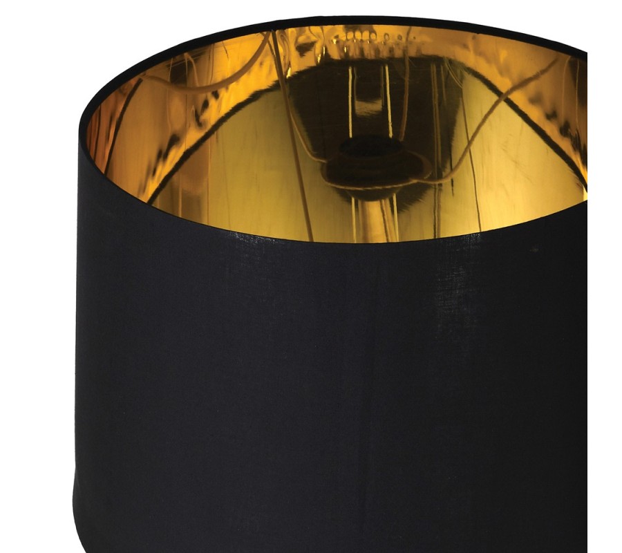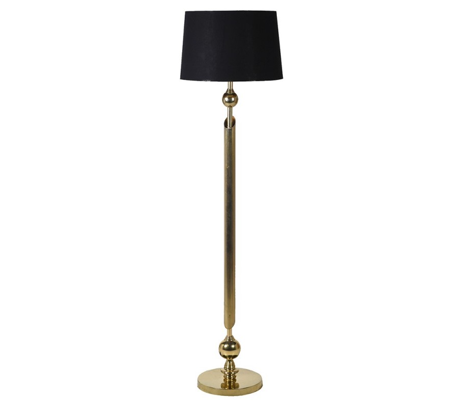 Art deco vysoká kovová zlatá stojaca lampa Kelly s valcovým textilným tienidlom v čiernej farbe a atypickou nohou 164 cm