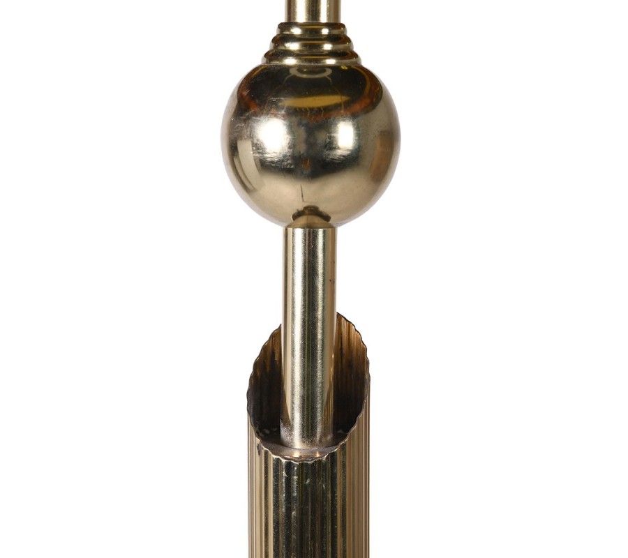 Najväčšiu pozornosť púta atypická kovová noha v zlatej farbe, ktorá je rozdelená do troch výrazných častí. Horná aj dolná časť sú ukončené guľovitými tvarmi, ktoré dodávajú lampe ladný rytmus. Stredná časť nohy je tvorená valcom s jemne šikmými skosenými koncami a je zdobená zvislými drážkami, ktoré vytvárajú zaujímavý vizuálny efekt a dodávajú telu lampy plastickosť. Celok uzatvára plná okrúhla podstava, ktorá zaisťuje stabilitu a zároveň dotvára dojem robustnosti a elegancie.