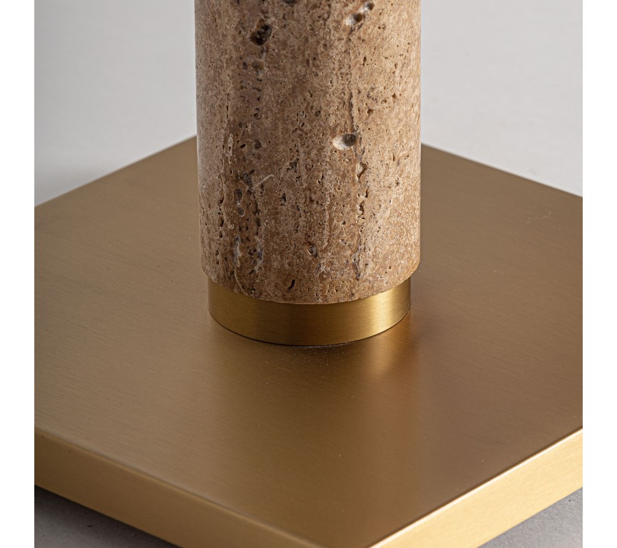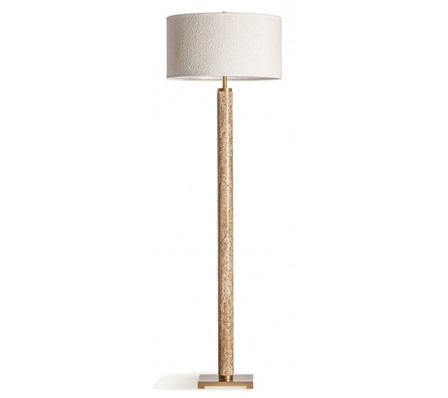 Luxusná stojaca lampa Jerf v štýle art deco s glamour nádychom zaujme svojím vysokým, štíhlym dizajnom a elegantnou kombináciou prírodného kameňa a jemného textilu. Jej valcová noha z travertínu v prírodnom béžovo-pieskovom odtieni pôsobí sofistikovane a vďaka prirodzenej štruktúre kameňa dodáva interiéru organickú textúru.