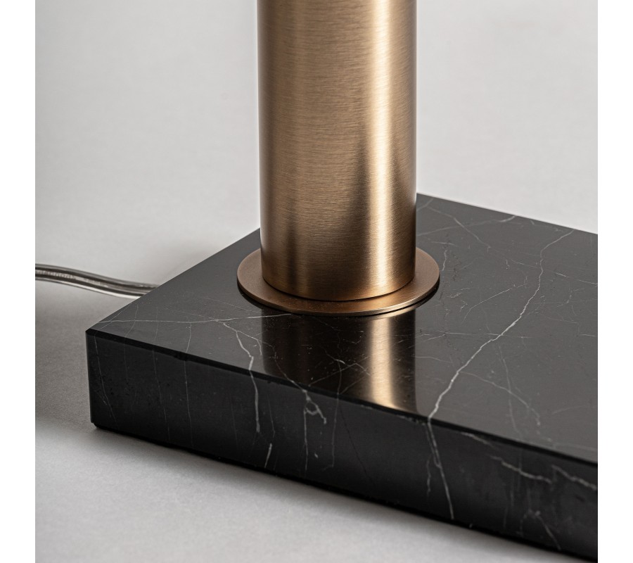 Stabilitu zabezpečuje mohutná obdĺžniková podstava z čierneho mramoru s bielymi žilkami, ktorá podčiarkuje luxusný charakter lampy a dodáva jej pevnosť. Tento nadčasový model je ideálny do moderných interiérov, kde vynikne ako štýlový doplnok v obývačke, spálni či pracovni. Skvele sa kombinuje s nábytkom so zlatými detailmi, mramorovými stolíkmi, čiernym zamatovým kreslom či sklenenými doplnkami, pričom v priestore vytvára exkluzívnu atmosféru s jemným retro nádychom.