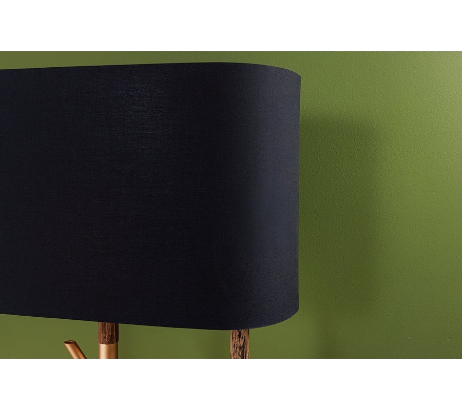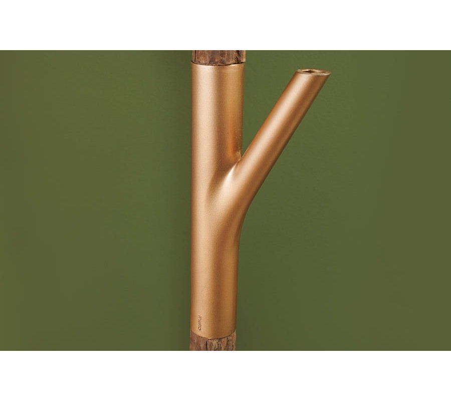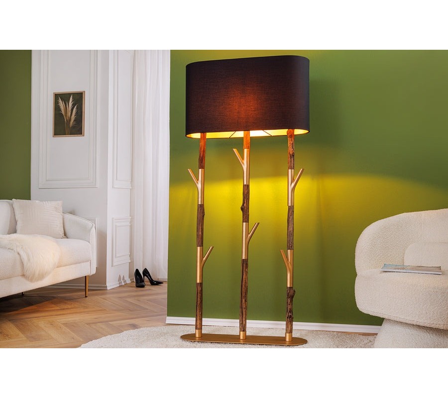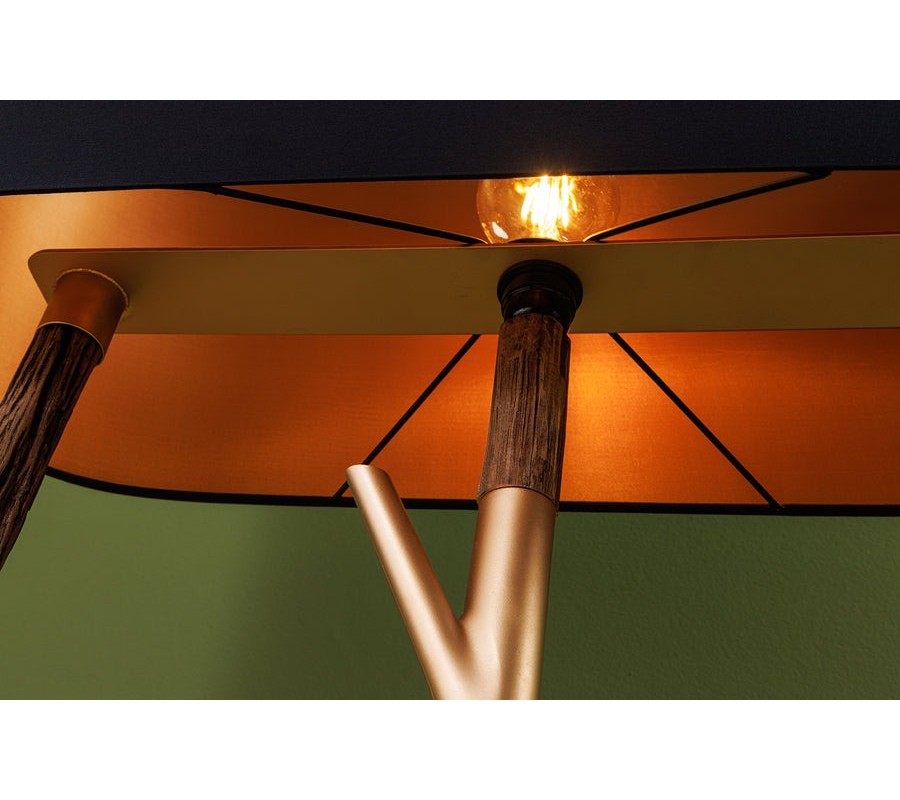 Základ lampy tvoria tri výrazné tyče, na ktorých sa striedajú drevené segmenty s autentickou štruktúrou a zlaté kovové časti. Z týchto kovových detailov vyrastajú ďalšie vetvovité prvky, ktoré pripomínajú rozvetvené konáre stromov. Celá konštrukcia je ukotvená na oválnej kovovej podstave v zlatej farbe, ktorá zaisťuje stabilitu a elegantne dotvára celkový dizajn.