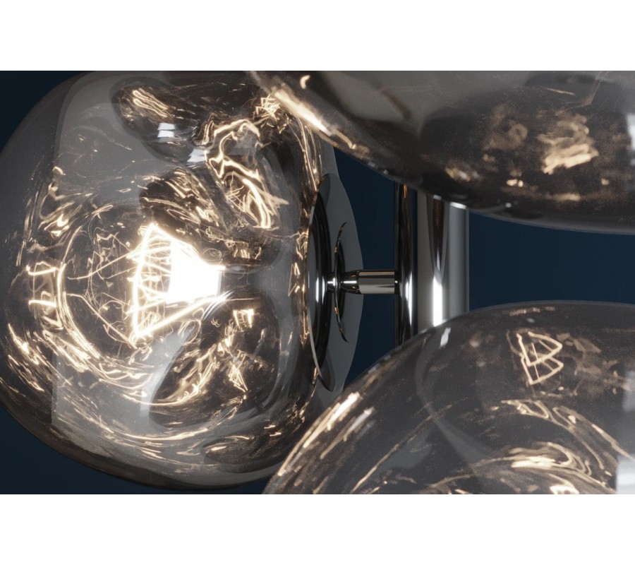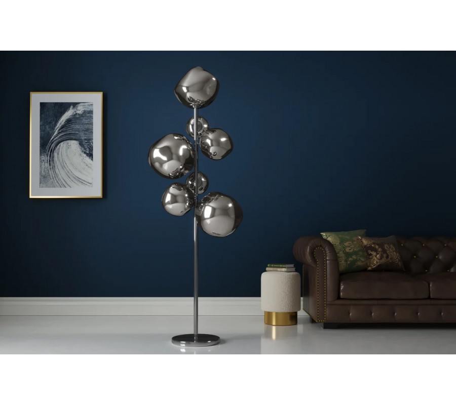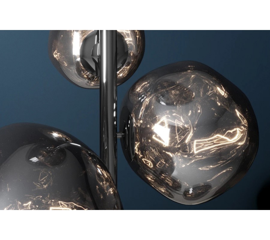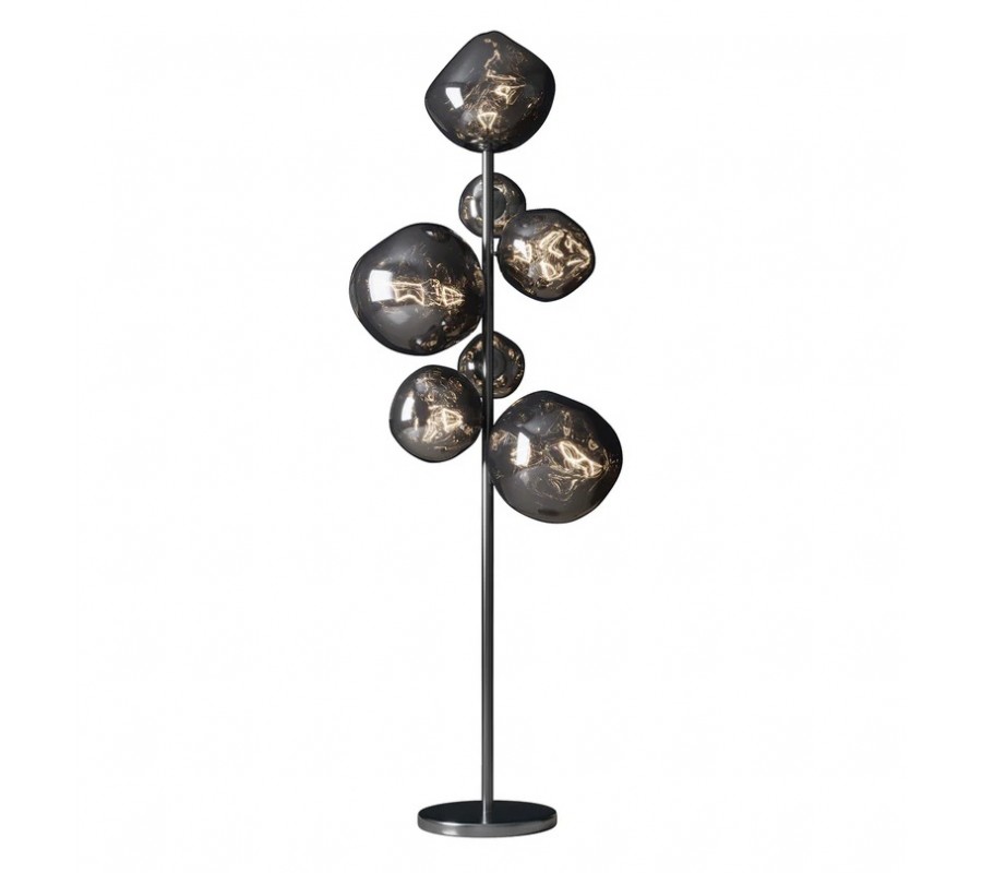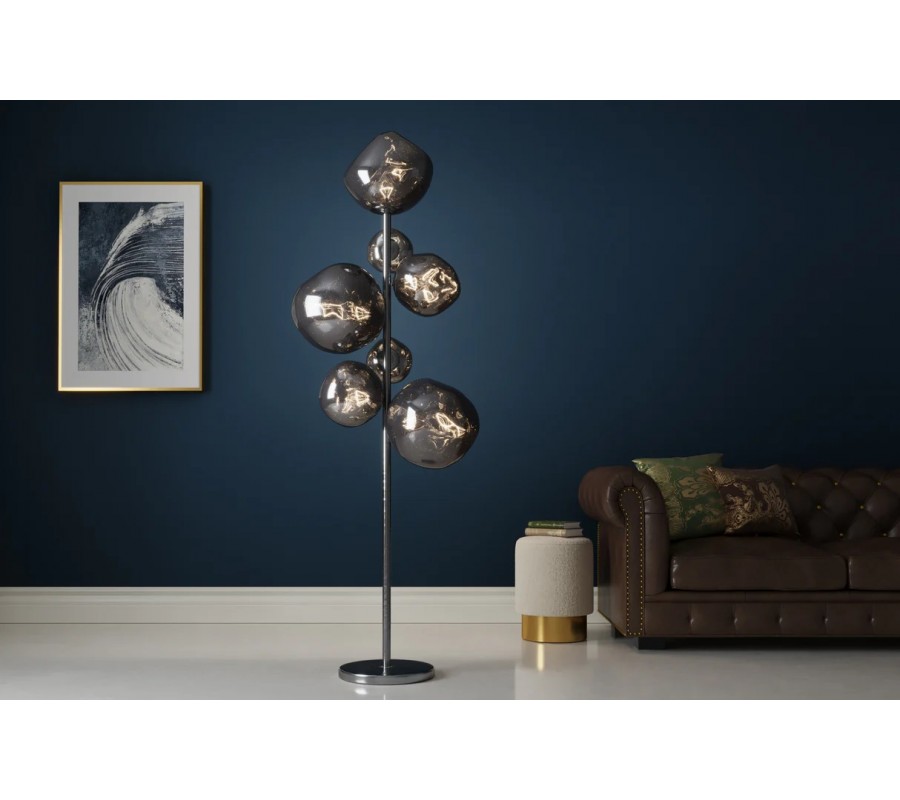 Stojaca lampa Kalan v elegantnom čiernom prevedení je výrazný dizajnový prvok, ktorý upúta organickými tvarmi a temným skleneným leskom. Sedem sklenených tienidiel v odtieňoch dymovo čiernej farby pripomína kvapky tekutiny alebo roztaveného skla a pôsobí ako zhmotnené svetlo v pohybe.