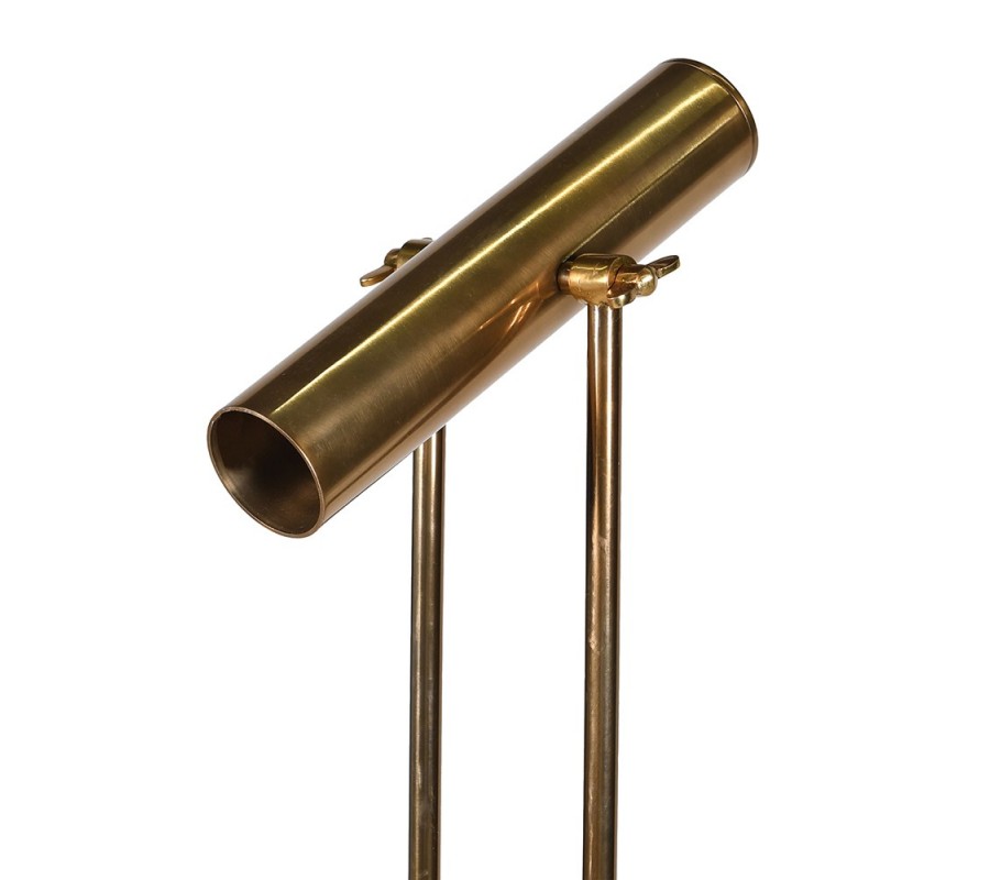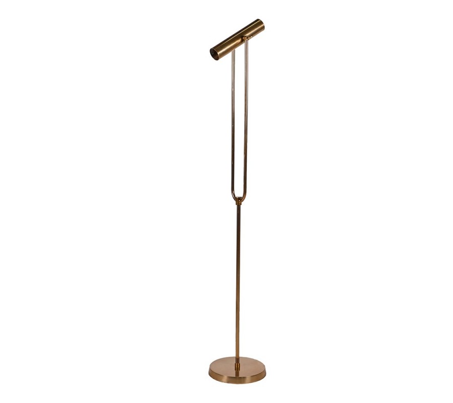 Lampa má minimalistickú štíhlu siluetu, vyrobenú z kovovej zliatiny. V spodnej časti sa nachádza okrúhla podstava, ktorá zaručuje výbornú stabilitu. K nej sa napája štíhla valcovitá noha, ku ktorej je asi v polovici výšky napojená dvojitá vidlica s oblúkom v spodnej časti. Vo vrchnej časti je k jej ramenám upevnené valcovité tienidlo pomocou dvoch výrazných skrutiek. Kombinácia kovu a výrazných konštrukčných detailov pôsobí industriálnym dojmom, zatiaľ čo prevedenie v zlatej farbe dodáva svietidlu luxusný dotyk.