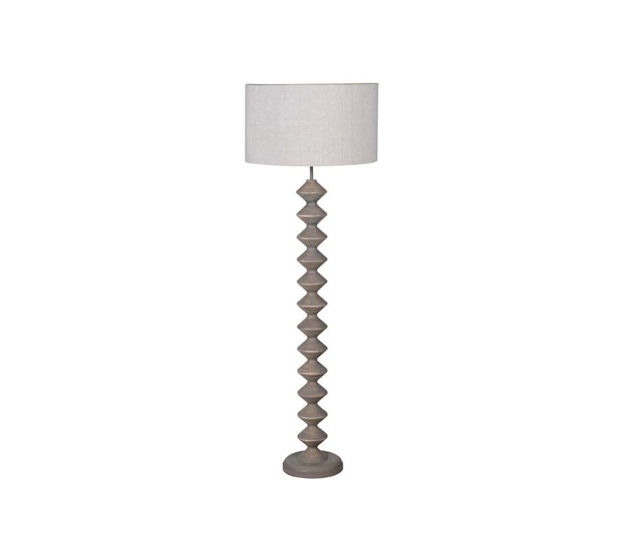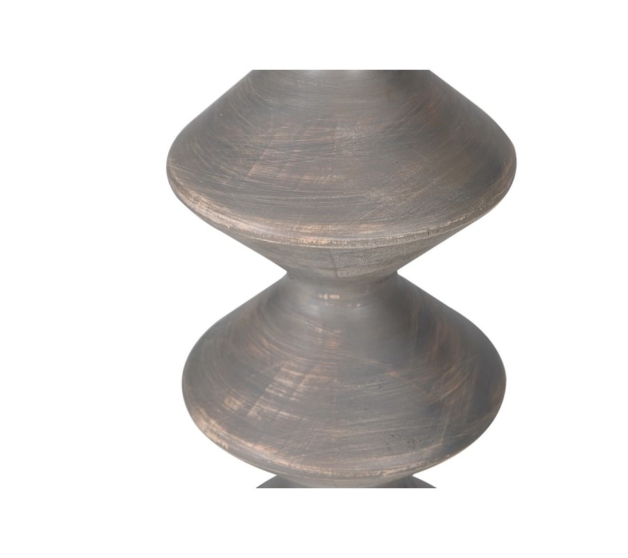 Stojaca lampa Quart spája prírodný charakter s eleganciou vidieckeho štýlu. Jej vysoká drevená noha v hnedosivej farbe zaujme vyrezávaným dizajnom tvoreným symetricky usporiadanými valcovitými segmentmi, ktoré vytvárajú rytmický, vlnovitý efekt. Každý segment má jemne zaoblené hrany, čo podčiarkuje prirodzenú plasticitu tvaru. Povrch nohy má decentný ošúchaný efekt na hranách výrezov, ktorý zvýrazňuje štruktúru dreva a dodáva lampe jemný vintage vzhľad s teplým tónom.