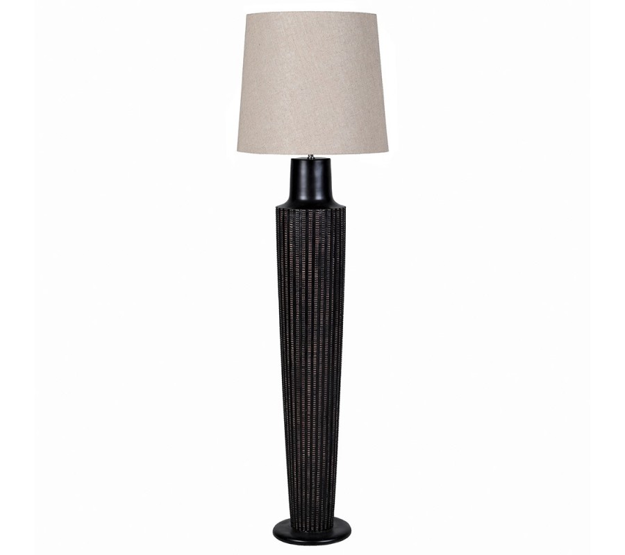 Dizajnová vintage stojaca lampa Katya s čiernou nohou s reliéfnym zdobením a sivým ľanovým tienidlom 166 cm