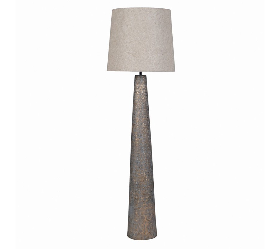 Dizajnová vintage stojaca lampa Artemis s vyrezávanou nohou v zlatej farbe so sivou patinou a ľanovým tienidlom 160 cm