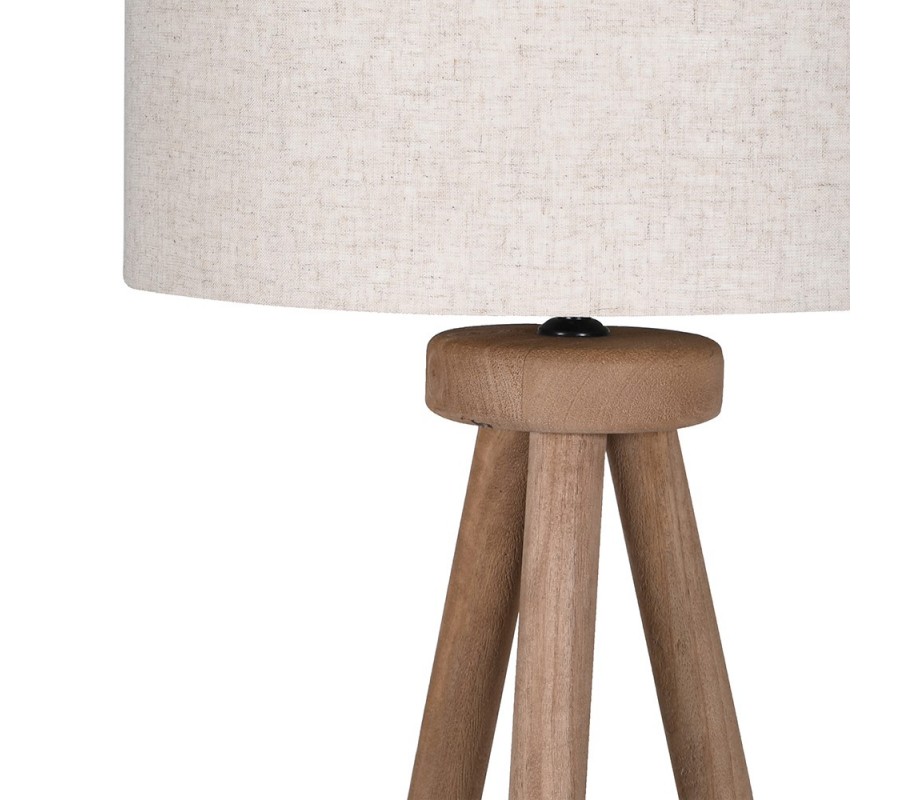 Lampu dopĺňa okrúhle valcové tienidlo z bavlny v béžovej farbe, ktoré jemne rozptyľuje svetlo a vytvára príjemnú, mäkkú svetelnú atmosféru. Kombinácia prírodného dreva a textilného tienidla pôsobí harmonicky a nadčasovo. Lampa je určená pre žiarovku typu E27 s maximálnym príkonom 40 W, čo umožňuje použiť klasickú aj LED žiarovku podľa požadovanej intenzity osvetlenia. Žiarovka nie je súčasťou balenia.